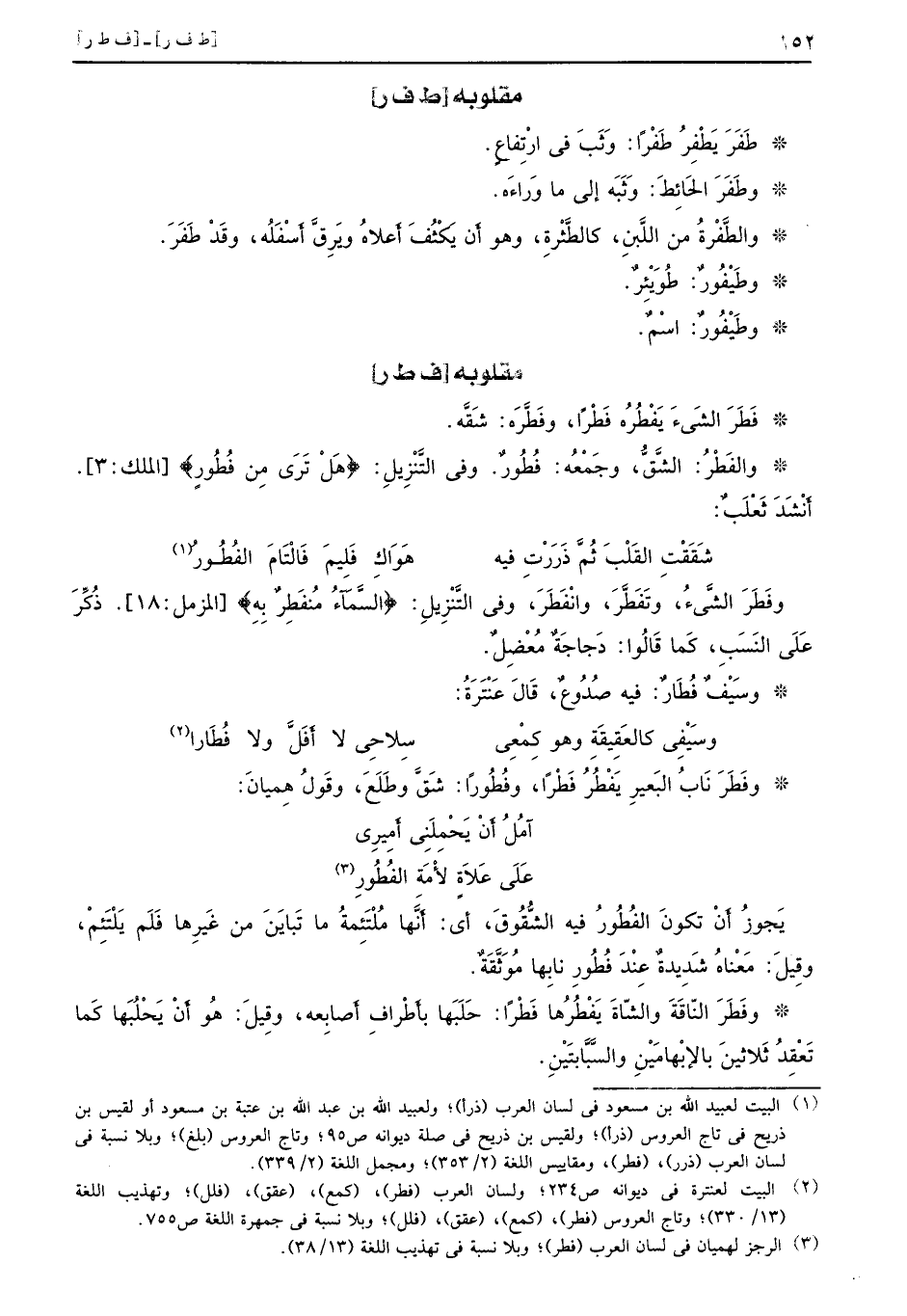 يَجوزُ أَنْ تكونَ الفُطُورُ فيه الشُّقُوقَ، أي: أََنَّها مُلْتَئِمةُ ما تَبايَنَ من غَيرِها فَلَم يَلْتَئِمْ، وقِيلَ: مَعْناهُ شَدِيدةُ عِنْدَ فُطُورِ نابِها مُوَثَّقَةٌ. وفَطَرَ النَّافَةَِ والشّاةَ يَفَطُرُها فَطْراً: حَلَبَها بأَطْرافِ أَصابِعه، وقِيلَِ: هُو أَنْ يَحْلُبَها كَما تَعْقَدُ ثَلاثِينَ بالإْبهامَيْنِ والسَّبَّابتَيْنِ.