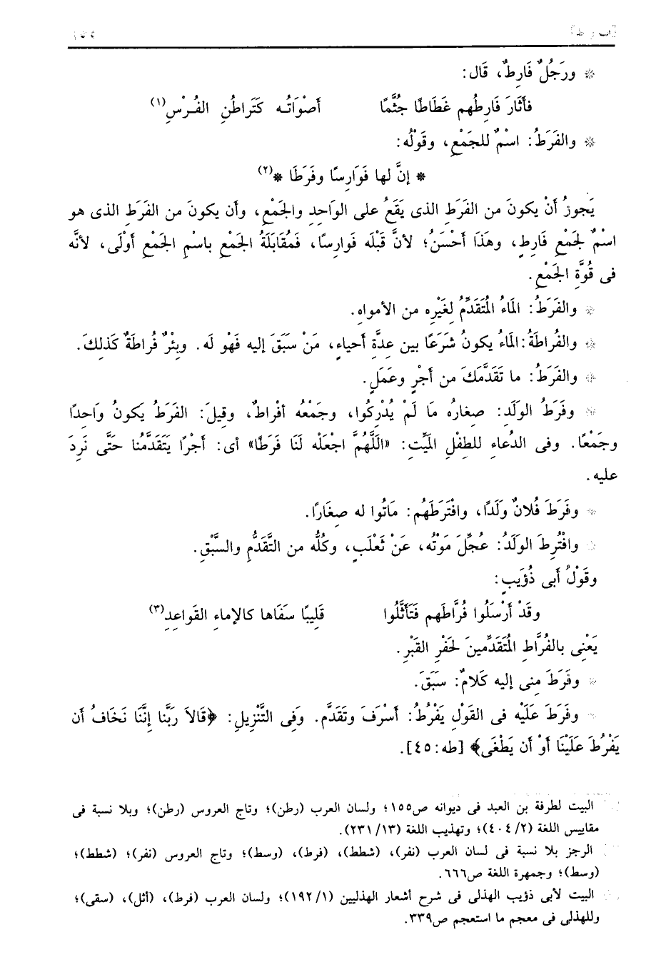 يَجوزٌ أَنْ يكونَ من الفَرطَ الذي يَقَعُ على الوَاحِدِ والجَمْعِ، وأَن يكونَ من الفَرَطِ الذي هو اسْمٌ لجَمْعِ فَارِطٍ، وهَذَا أَحْسَنُ؛ لأنَّ قَبْلَه فَوارِساً، فَمُقَابَلَةً الجَمْعِ باسْمِ الجَمْعِ أَوْلَي، لأنَّه في قُوَّةِ الجَمْعِ. والفَرَطُ: المَاءُ المُتَقَدِّمُ لًِغَيْرِه من الأمواهِ. والفُراطَةُ: المَاءُ يكونُ شَرَعاً بين عِدَّةِ أَحياءِ، مَنْ سَبَقَ إليه فَهْو لَه. وبِئْرٌ فُراطَةٌ كَذِلكَ. والفَرَطُ: ما تَقَدَّمَكَ من أَجْرٍ وعَمَلٍ. وفَرَطُ الوَلَدِ: صِغارُه مَا لَمْ يُدْرِكُوا، وجَمْعُه أفْراطٌ، وقِيلَ: الفَرَطُ يَكونُ وَاحِداً وجَمْعاً. وفي الدُعاءِ للطْفِلِ المَيِّت: ((الَلَّهُمَّ اجْعَلْه لَنَا فَرَطاً)) أي: أَجْراً يَتَقدَّمُنا حَتَّى نَرِدَ عليه. وفَرَطُ فُلانٌ وَلَداً، وافْتَرطَهُم: مَاتُوا له صِغَاراً. وافْتُرِطَ الوَلَدُ: عُجِّل مَوْتُه، عَنْ ثَعْلَبٍ، وكُلُّه من التَّقَدُّمِ والسَّبْقِ. وقَوْلُ أَبي ذُؤَيب:
