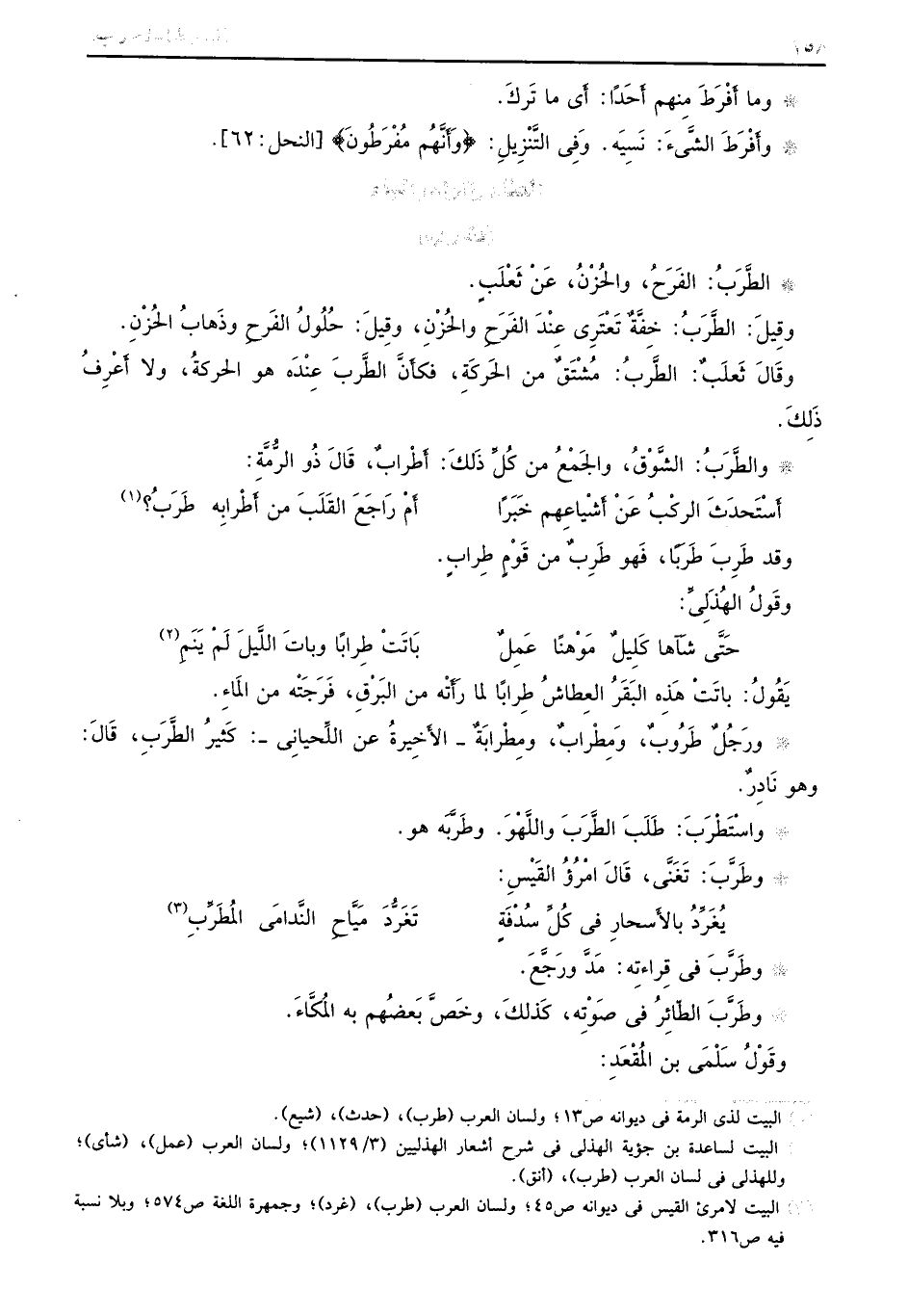 يَقُولُ: باتَتْ هَذِه البَقُرَ العِطاشُ طِراباً لما رَأَتْه من البَرْقِ، فَرَجَتْه من المَاء. ورَجُلٌ طَرُوبٌ، ومَطِرابٌ، ومَطْرابَةٌ - الأخيِرةُ عن اللِّحيانِي _: كَثِيرُ الطَّرَب، قَالَ: وهو نَادِرٌ. واستْطَرَبَ: طَلَبَ الطَّرَبَ واللَّهْوَ. وطَرَّبَه هو. وطَرَّبَ: تَغَنَّي، قَالَ امرْؤُ القَيْسِ: