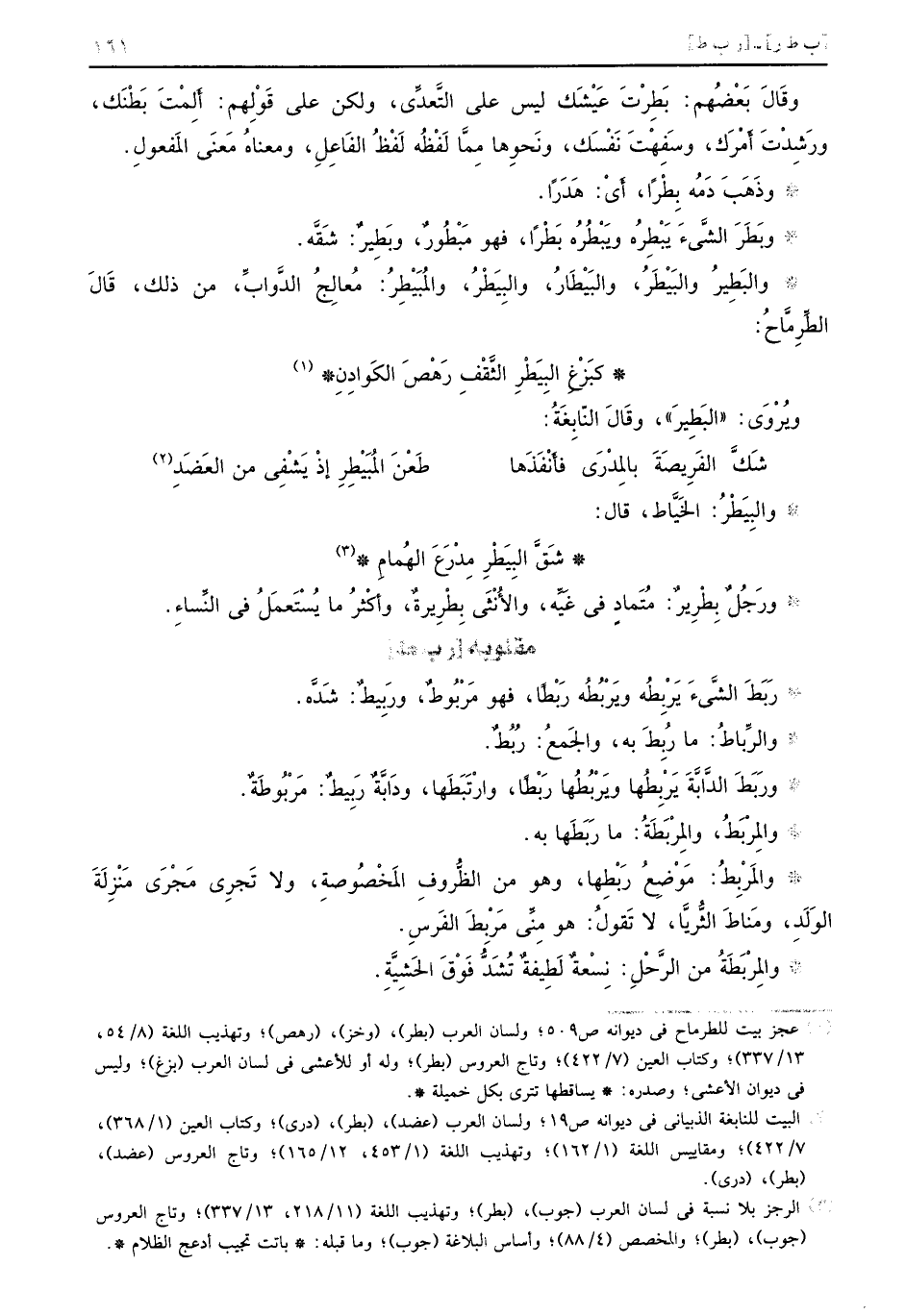 وقَالَ بَعْضَهم: بَطِرْتَ عَيْشَك ليس على التَّعدِّي، ولكن على قَوْلِهم: أَلْمْتَ بَطْنَك، ورَشِدْتَ أَمْرَك، وسَفِهْتَ نَفْسَك، ونَحِوها مِماَّ لَفْظُه لفظُ الفَاعِلِ، ومعناهُ مَعَنى المَفعولِ. وذَهَبَ دَمْه بِطْراً، أيْ: هَدَراً. وبَطَرَ الشَّيءَ يَبْطِرهُ ويَبْطُرُه بَطْراً، فهو مَبْطُورٌ، وبَطَيرٌ: شَقَّه. والبَطِيرُ والبَيْطَرُ، والبَيْطَارُ، والبِيَطْرُ، والمُبَيْطِرُ: مُعالِجُ الدَّوابَّ، من ذلك، قَالَ الطِّرِمَّاحُ.