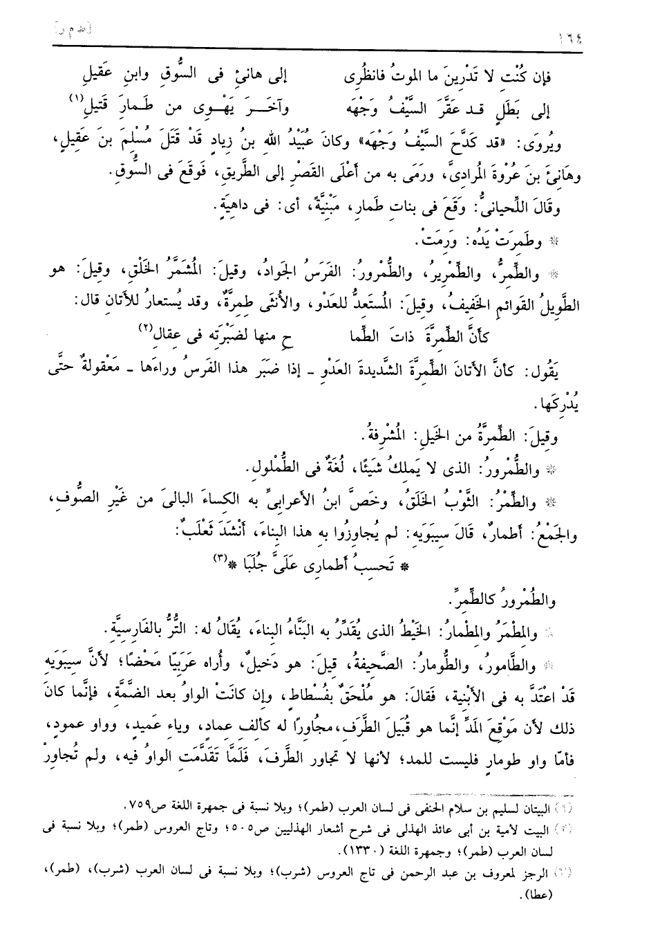 ويُروَي: ((قد كَدَّحَ السَّيْفَ وَجْهَه)) وكانَ عُبَيْدُ اللهِ بن زِيادٍ قَدْ قَتَلَ مُسْلَمَ بنَ عَقِيلٍ، وِهَانيءِ بنَ عُرْوةً المُرادِيَّ، ورَمَي به من أَعْلَى القَصْرِ إلى الطَّريقِ، فَوقَعَ في السُّوقِ. . وقَالَ اللِّحيانيُّ: وَقَعَ في بناتِ طَمارِ، مَبْنِيَّةً، أي: في داهِيَةٍ. وطَمِرَتْ يَدُه: وَرِمَتْ. والطِّمرُّ، والطِّمْرِيرُ، والطُّمْرورُ: الفَرَسُ الجَوادُ، وقِيلَ: المُشَمَّرُ الخَلْقِ، وقِيلَ: هو الطَّوِيلُ القَوائمِ الخِفِيفُ، وقِيلَ: الُمسَتعِدُّ للعَدُو، والأُنَثَى طِمِرَّةٌ، وقد يُستعارُ للأَتانِ قال:
