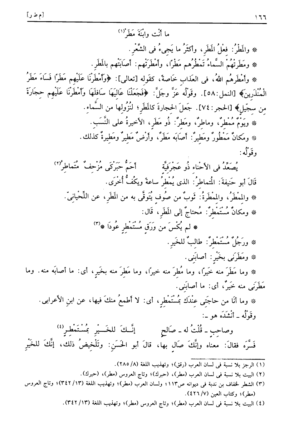والمَطْرُ: فِعْلُ المَطَرِ، واكثَرُ ما يِجِيءُ في الشِّعْرِ. ومَطَرتْهُمْ السَّماءُ تَمْطُرُهم مَطْراً، وأَمْطَرَتْهم: أَصَابَتْهم بالمَطَر. وأَمْطَرهُم اللهُ، في العَذاب خَاصةً، كقَولِه [تعالي] : {وَأَمْطَرْنَا عَلِيهْم مَطَراً فَسَادَ مَطَرُ المْنَذَرِين} [النمل: 58] . وقَوْلُه عَزَّ وجَلَّ: {فَجَعَلْنَِا عَالِيَهَا سَافِلَها وَأَمْطَرنَا عَلْيهِم حِجَارَةً مِن سِجّبلٍ} [الحجر: 74] . جَعَلَ الحِجارةَ كالمَطَر؛ لنُزُوِلها من السَّماءِ. ويَوْمٌ مُمْطِرٌ، وماطِرٌ، ذُو مَطَرِ، الأَخيرةُ على النَّسَبِ. ومَكانٌ مَمْطُورٌ ومَطِيرٌ: أَصَابَه مَطَرٌ، وأَرْضٌ مَطِيرٌ ومَطِيرةٌ كذلك. وقَوْلُه: