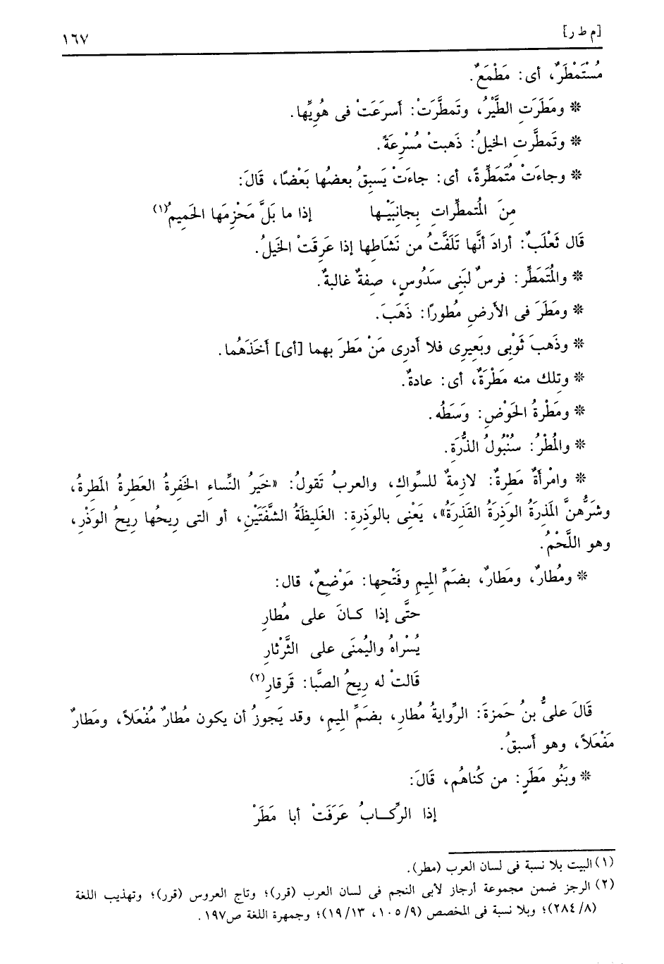 قَال ثَعْلَبٌ: أرادَ أَنَّها تَلَفَّتُ من نَشَاطِها إذا عَرِقَتْ الخَيلُ. والمُتَمَطِّر: فرسٌ لبَنِي سَدُوسٍ، صِفةٌ غالبةٌ. ومَطَرَ في الأَرضِ مُطوراً: ذَهَبَ. وذَهَبَ ثَوْبِي وبَعيرِي فلا أَدرِي مَنْ مَطَر بهما [أي] أَخَذَهما. وتِلك منه مَطْرَةٌ، أي: عادةٌ. ومَطْرةُ الحَوْضِ: وَسَطُه. والمُطْرُ: سُنْبُولْ الذُّرَةِ. وامْرأَةٌ مَطِرةٌ: لازِمةٌ للسِّواكِ، والعرُب تَقولُ: ((خَيرُ النِّساءِ الخَفِرةُ العَطِرةُ المَطِرةُ، وشَرُّهنَّ المَذِرَةُ الوَذِرَةُ القَذِرَِةُ)) ، يِعْنِي بالوَذِرِه: ((الغَلِيظَةُ الشَّفتَيْنِ، أو التي رِيحُها رِيحُ الوَذْرِ، وهو اللَّحْمُ. ومُطارٌ، ومَطارٌ، بضَمِّ المِيمِ وفَتْحِها: مَوْضِعٌ، قال: