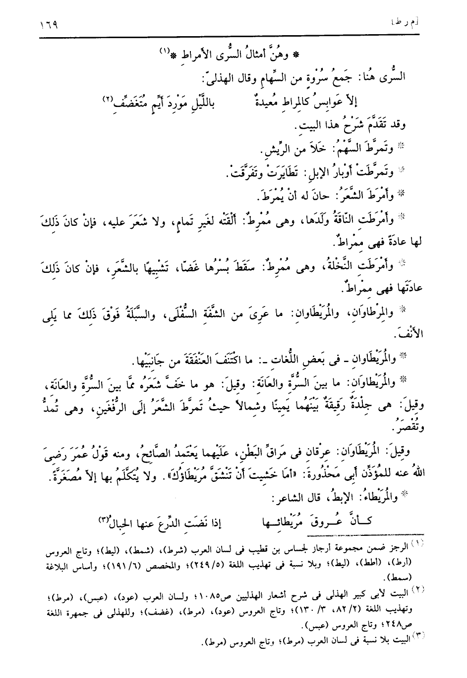 وقد تَقَدَّمًَ شَرْحُ هذا البيتَِ. وتَمرَّطَ السَّهْمُ: خَلاَ من الرِّيشِ. وتَمرَّطَتْ أَوْبارُ الإبلِ: تَطَايَرَتْ وتَفَرَّقَتْ. وأَمْرَطَ الشَّعَرُ: حانَ له أنْ يُمْرَطَ. وأَمْرَطَتِ النَّاقَةُ وَلَدَها، وهي مُمْرِطٌ: أَلْقَتْه لغَيرِ تَمامٍ، ولا شَعَرَ عليه، فإنْ كانَ ذَلَِكَ لها عادَةً فهي مِمْراطٌ. والمِرْطاوَانِ، والمُرْيْطَاوانِ: ما عَرِيَ من الشَّفَةِ السُّفْلَي، والسَّبَلَة فَوْقَ ذَلِكَ مما يَلِي الأَنْفَ. والمُرِيْطَاوان _ في بَعض اللُّغاتِ _: ما اكْتَنَفَ العَنْفَقَةَ من جَانِبَيْها. والمُرَيْطاوَان: ما بينَ السُّرَّةِ والعَانَةِ: وقِيلَ: هو ما خَفَّ شَعَرُه ممّا بينَ السُّرَّةِ والعَانَةِ، وقِيلَ: هي جِلْدَةٌ رَقَيقَةٌ بَيْنَهُما يَمِيناً وشِمالاً حيثُ تَمرَّطَ الشَّعَرُ إلَى الرُّفْعَينِ، وهي تَمدُّ وتَقْصَرُ. وقِيلَ: المُرَيْطَاوَانِ: عِرْقانِ في مَراق البَطْنِ، عَلَيْهما يَعْتَمِدُ الصَّائِحِ، ومنه قَوْلُ عُمَرَ رَضِيَ اللهُ عنه للمُؤَذِّن أَبِي مَحْذُورةَِ: ((أمَا خَشٍِ يتَ أَنْ تَنْشَقَّ مُرَبْطَاؤَكَ)) . ولا يتُكَّلَمُ بها إلاّ مُصَغَرَّةً. والمُرَبْطاءُ: الإبطُ، قال الشاعر: