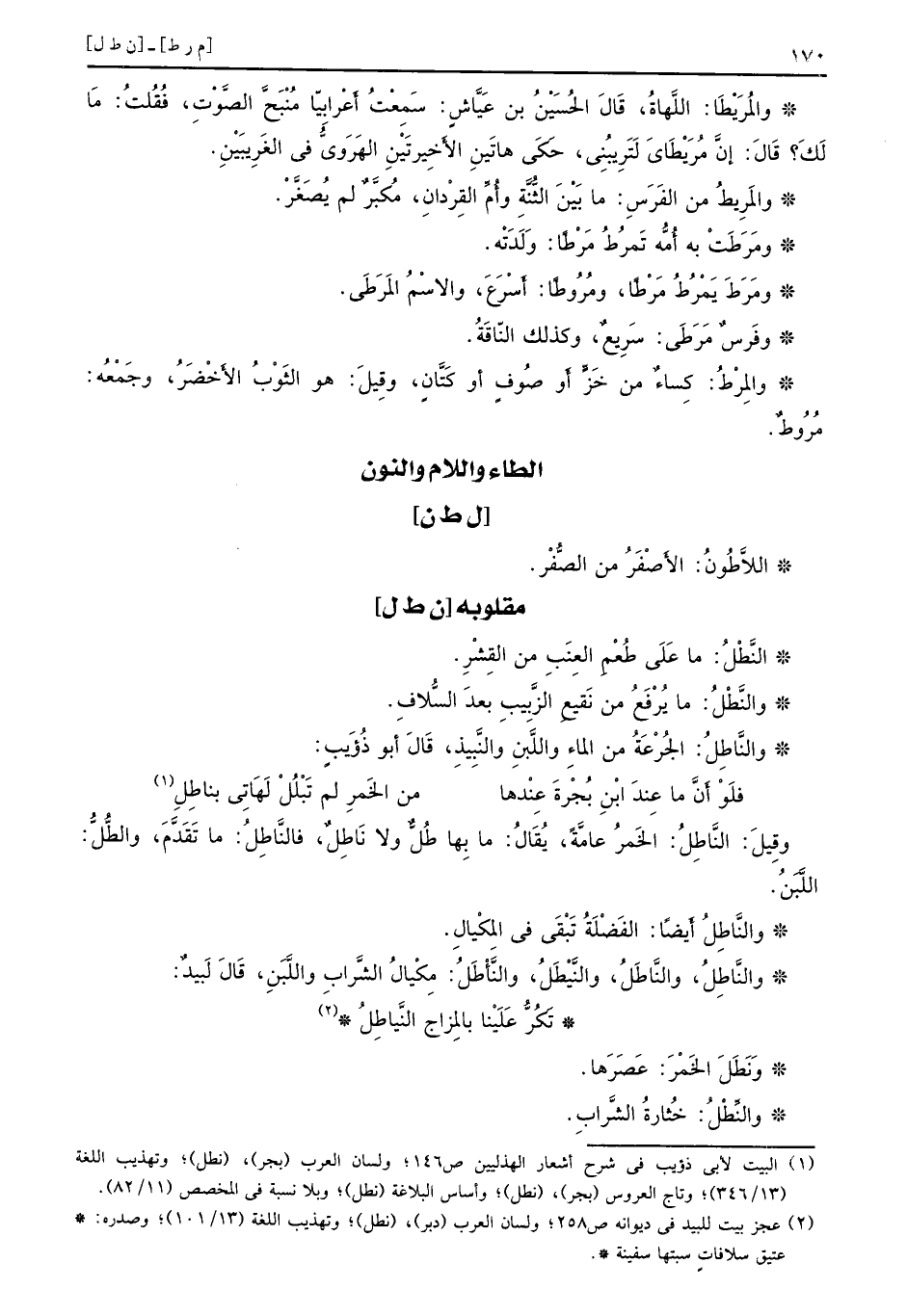 [ن ط ل] النَّطْلُ: ما عَلَى طُعْمِ العِنَبِ من القِشْرِ. والنَّطْلُ: ما يُرْفَعُ من نَقيعِ الزَّبِيبِ بعدَ السُّلافِ. والنَّاطِلُ: الجُرْعَةُ من الماءِ واللَّبنِ والنَّبِيذِ، قَالَ أبو ذُؤَيبٍ: