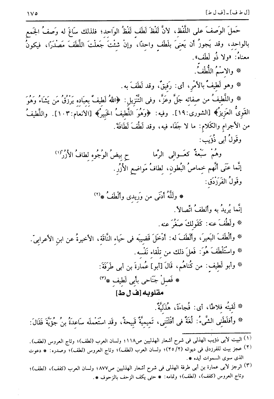 حَملَ الوَصفُ على اللَّفْظِ، لأنَّ لَفْظَ لَطَفِ لَفْظُ الوَاحِدِ؛ فلذلك سَاغَ له وَصفُ الجَمعِ بالواحِدِ، وقد يَجوزُ أَن يَعِنيَ بلَطَفٍ واحِداً، وإنْ شِئْتَ جَعلْتَ اللَّطَفَ مَصْدَراً، فيكونُ معناهُ: ((ولا ذُو لَطَف)) . والاِسْمُ اللُّطْفُ. وهو لَطِيفٌ بالأَمْرِ، أي: رَفِيقٌ، وقد لَطَفَ به. واللَّطِيفُ من صِفاتِه جَلَّ وعَزَّ، وفي التَّنْزِيلِ: {الله لطيف بعباده يرزق من يشاء وهو القوي العزيز} [الشورى: 19] . وفيه: {وهو اللطيف الخبير} [الأنعام: 103] . واللَّطيفُ من الأَجرامِ والكَلامِ: ما لا جَفَاء فيه، وقد لَطفَ لَطَافَةً. وقَولُ أبي ذُؤًَيب: