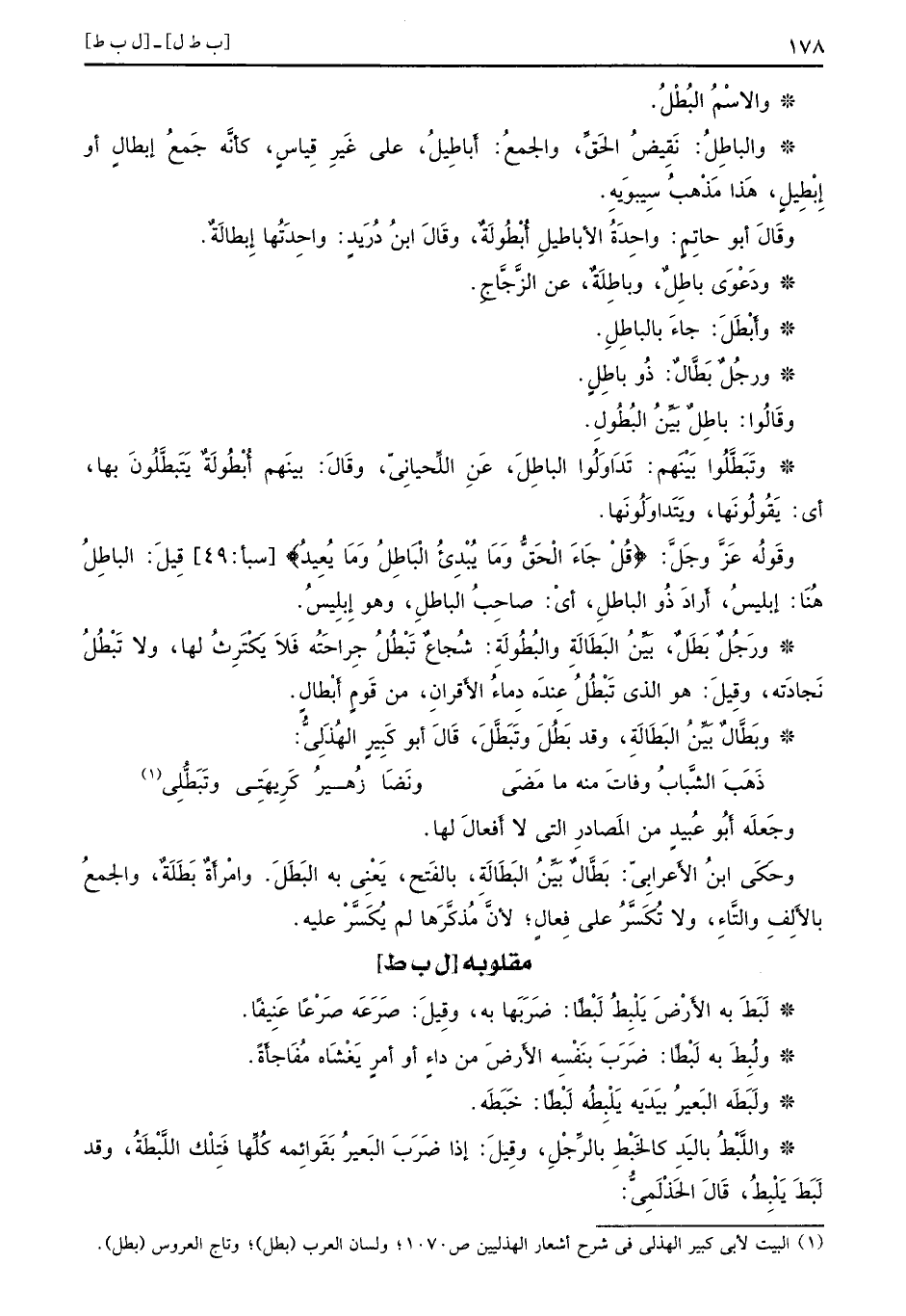 والاسْمُ البُطْلُ. والباطِلُ: نَقِيضُ الحَقِّ، والجمعُ: أَباطِيلُ، على غير قِياسٍ، كأنَّه جَمعُ إبطالٍ أو إِبْطِيلِ، هَذا مَذْهبُ سِيبَوَيهِ. وقَالَ أبو حاتِمٍ: واحِدَةُ الأباطيلِ أُبْطُولَهًٌ، وقَالَ ابنُ دُرَيدٍ: واحِدَتُها إِبطالَةٌ. ودَعْوَى باطِلٌ، وباطِلَةٌ، عن الزَّجَّاجِ. وأَبْطَلَ: جاءَ بالباطِلِ. ورجُلٌ بَطَّالٌ: ذُو باطِلِ. وقَالُوا: باطِلٌ بَيِّنُ البُطُولِ. وتَبَطَّلُوا بَيْنَهم: تَدَاوَلُوا الباطِلَ، عَنِ اللِّحيانِيّ، وقَالَ: بينَهم أُبْطُولَةٌ يَتَبطَّلُونَ بها، أي: يَقُولُونَها، ويَتَداوَلُونَها: وقَولُه عَزَّ وجَلَّ: {قل جاء الحق وما يبدئ الباطل وما يعيد} [سبأ: 49] قِيلَ: الباطِلُ هُنَا: إبليسُ، أرادَ ذُو الباطِل، أيْ صاحِبُ الباطلِ، وهو إِبِليسُ. ورَجُلٌ بَطَلٌ، بَيِّنُ البَطَالَةِ والبُطُولَةِ: شُجاعٌ تَبْطُلُ جِراحَتُه فَلاَ يَكْتَرِثُ لها، ولا تَبْطُلُ نَجادَتهُ، وقِيلَ: هو الذي تَبْطُلُ عِندَه دِماءُ الأَقرانِ، من قِومٍ أَبْطالِ. وبَطَّالٌ بَيَّنُ البَطَالَةِ، وقد بَطُلَ وتَبَطَّلَ، قَالَ أبو كَبِيرٍ الهُذَلِيُّ: