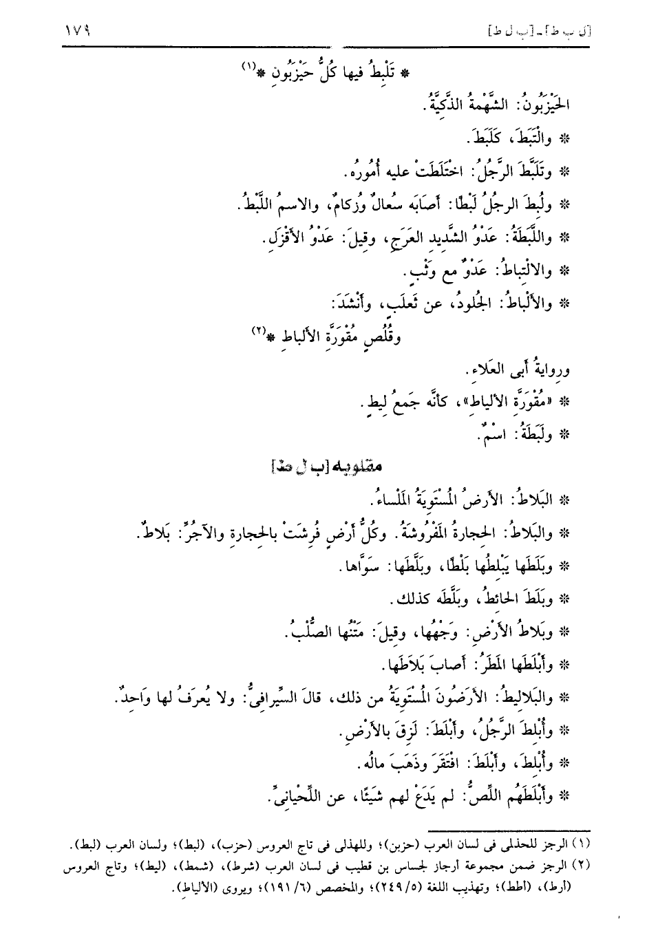 الحَيْزَبُونُ: الشَّهْمةُ الذَّكِيَّةُ. والتْبَطَ، كَلَبَطَ. وتَلَبَّطَ الرَّجُلُ: اخْتَلَطَتْ عليه أُمُورُه. ولُبَطَ الرجُلُ لَبْطاً: أَصَابَه سُعالٌ وُزكامٌ، والاسمُ اللَّبْطُ. واللَّبَطَةُ: عَدْوُ الشَّديِدِ العَرَجِ، وقِيلَ: عَدْوُ الأَقْزَلِ. والالْتِباطُ: عَدْوٌ مع وَثْبٍ. والأَلْباطُ: الجُلودُ، عن ثَعلَبٍ، وأَنْشَدَ: