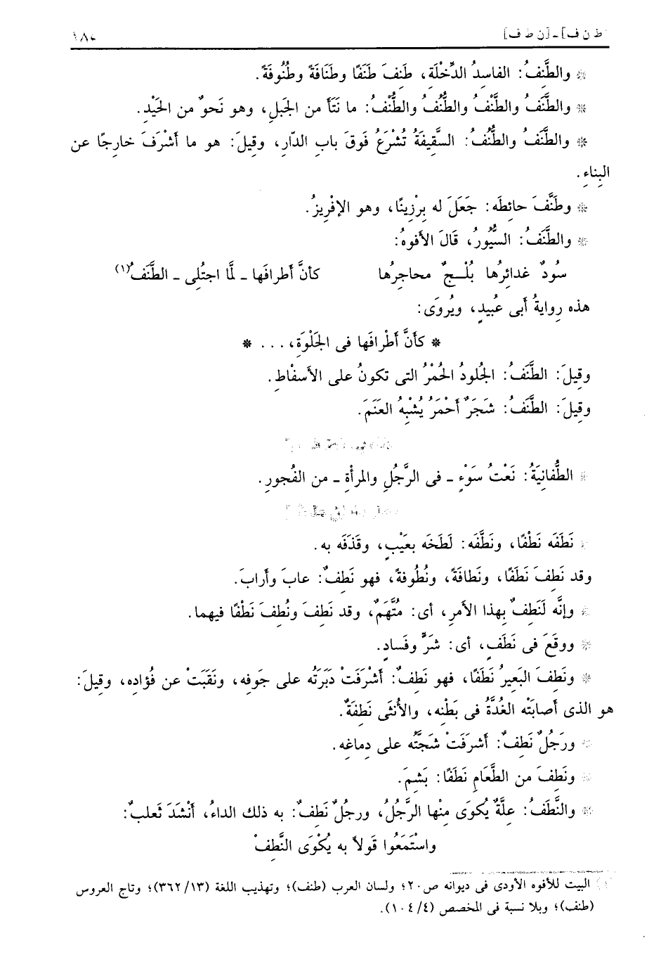والطَّنِفُ: الفاسِدُ الدِّخْلَةِ، طَنِفَ طَنَفاً وطَنَافَةً وطُنُوفَةٍ. والطَّنَفُ والطَّنْفُ والطُّنُفُ والطُّنفُ: ما نَتَأَ من الجَبلِ، وهو نَحوٌ من الحيْدِ. والطَّنَفُ والطُّنفُ: السَّقِيفَةُ تُشْرعُ فَوقَ بابِ الدّارِ، وقِيلَ: هو ما أَشْرَفَ خارِجاً عن البِناءِ. وطَنَّفَ حائِطَه: جَعَلَ له بِرْزِيناً، وهو الإفْرِيزُ. والطَّنَفُ: السُّيُورُ قَالَ الأَفوهُ: