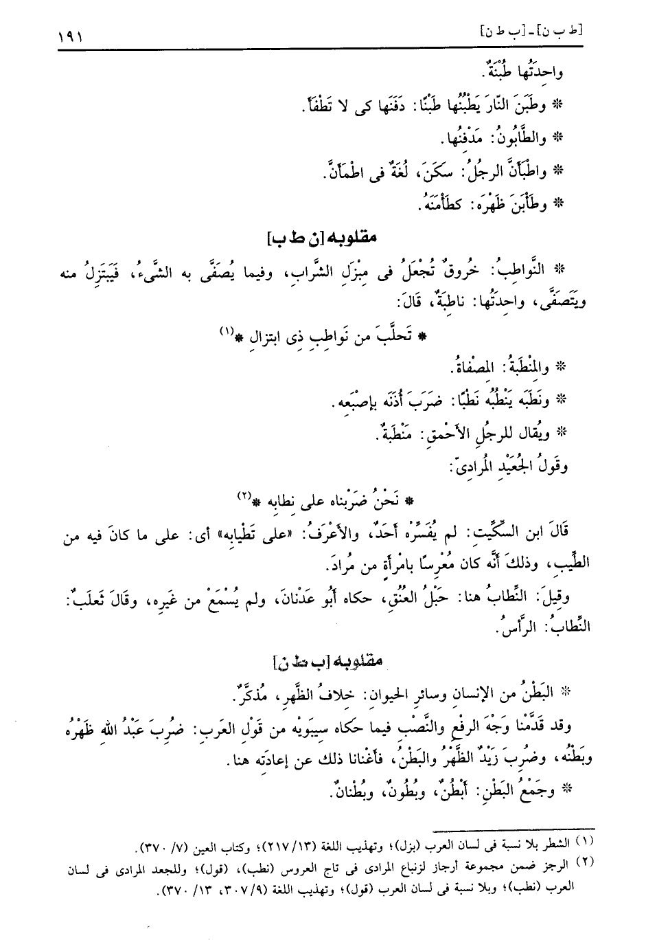 [ب ط ن] البَطْنُ من الإنسانِ وسائرِ الحيوانِ: خِلافُ الظَّهرِ، مُذكَّرٌ. وقد قَدَّمْنا وَجْهَ الرفْعِ والنَّصْبِ فيما حَكاه سِيبَويْه من قَوْلِ العَربِ: ضُرِبَ عَبْدُ اللهِ ظَهْرُه وبَطْنُه، وضَرِبَ زَيْدٌ الظَّهْرُ والبَطْن، فأغْنانا ذلك عن إعادَتِه هنا. وجَمْعُ البَطْنِ: أَبْطُنٌ، وبُطُونٌ، وبُطْنانٌ.