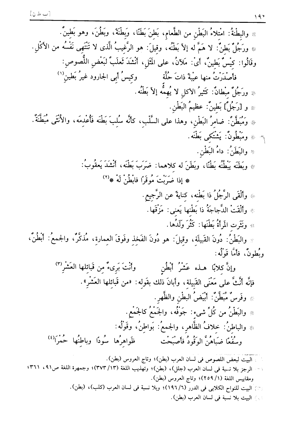 ورَجُلٌ مِبْطانٌ: كَثيرُ الأكلِ لا يُهِمُّه إلاّ بَطْنُه. و [رَجَلٌ] بَطِينٌ: عظيمُ البَطْنِ. وَمُبَطَّنٌ: ضامِرُ البَطْنِ، وهذا على السَّلْبِ، كأَنَّه سُلِبَ بَطْنَه فَأُعْدِمَه، والأُنْثَى مُبَطَّةٌ. ومَبْطُونٌ: يَشْتَِكِي بَطْنَه. والبَطَنُ: داءُ البَطْنِ. وبَطَنَه يَبْطُنُه بَطْناً، وبَطَنَ له كِلاهما: ضَرَبَ بَطْنَه، أَنْشَدَ يَعقُوبُ: