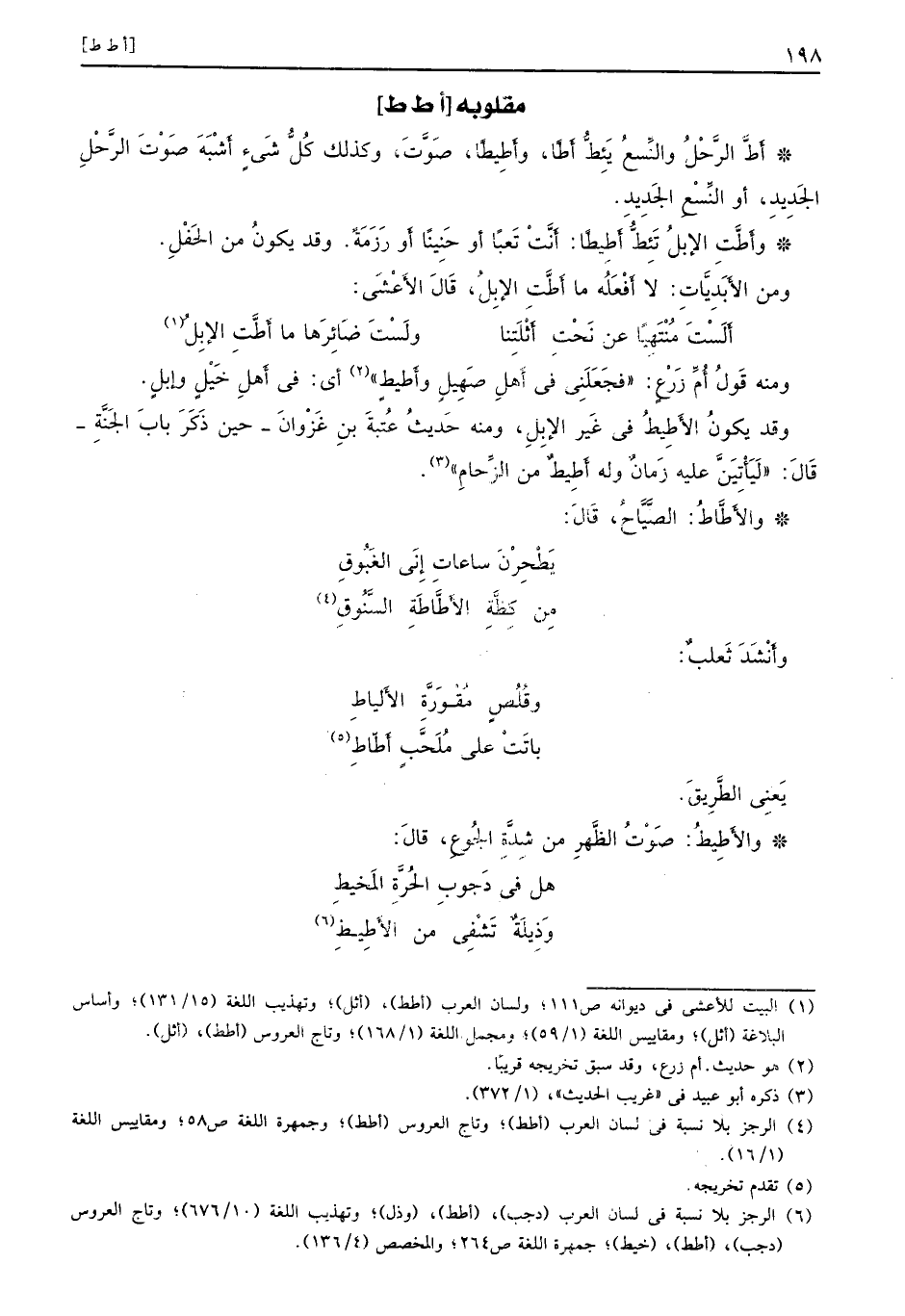 [أط ط] أَطَّ الرَّحْلُ والنِّسعُ يَئِطُّ أَطاً، وأَطِيطاً، صَوَّتَ، وكذلك كُلُّ شَيءٍ أَشْبِهَ صَوْتَ الرَّحْلِ الجَدِيدِ، أو النِّسْعِ الجِدِيد. وأَطَّتِ الإبلُ تَئِطُّ أَطِيطاً: أَنَّتْ تَعباً أو حَنِيناً أَو رَزَمَةً. وقد يكونُ من الحَفْلِ. ومن الأَبْدِيَّاتِ: لا أَفْعَلُه ما أَطَّت الإبِلُ، قَالَ الأَعْشَى: