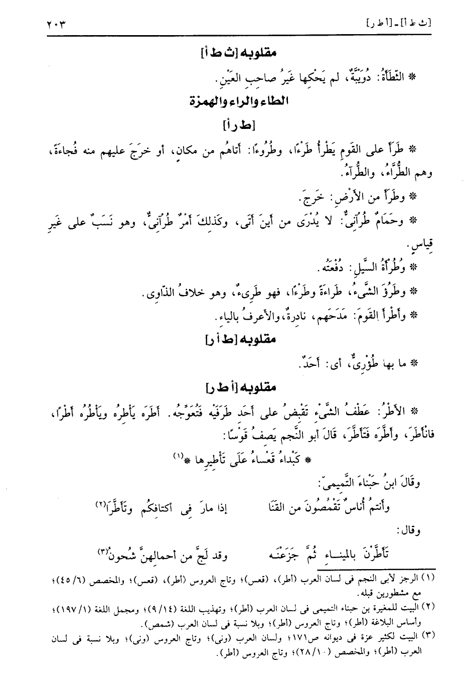 [ط ر أ] طَرَأَ على القَومِ يَطْرأُ طَرْءاً، وطُرُوءاً: أَتاهُم من مكانٍ، أو خَرجَ عليهم منه فُجاءةً وهو الطُّرَّاءُ، والطُّرآءُ. وطَرَأَ من الأَرْضِ: خَرجَ. وحَمَامٌ طُرُآنِيٌّ: لا يُدْرَي من أَينَ أَتَي، وكَذِلكَ أًَمْرٌ طُرْآنِيٌّ، وهو نَسَبٌ على غَيرِ قِياسٍ. وُطُرْأَةُ السَّيِلِ: دُفْعَتُه. وطَرُؤَ الشَّيءُ، طَراءةُ وطَرْءاً، فهو طَرِيءٌ، وهو خلافُ الذّاوِي. وأَطْرأَ القَومَ: مَدَحَهم، نادِرةٌ، والأَعرفُ بالياءِ.