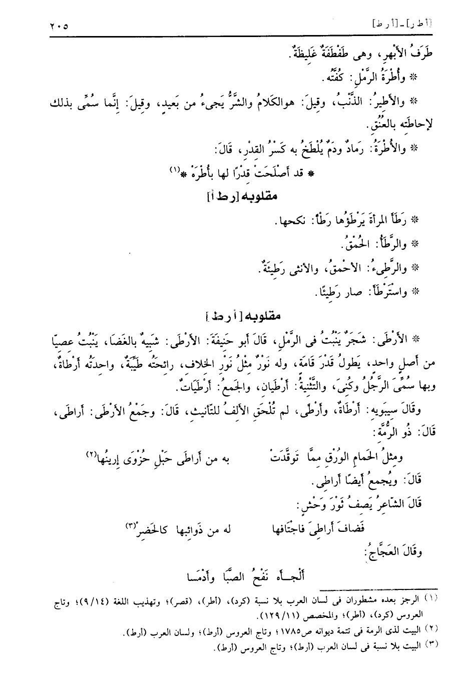 قَالَ: ويُجمعُ أَيضاً أًَراطِي. قَالَ الشّاعُرِ يَصِفُ ثَوْرَ وَحْشٍ: