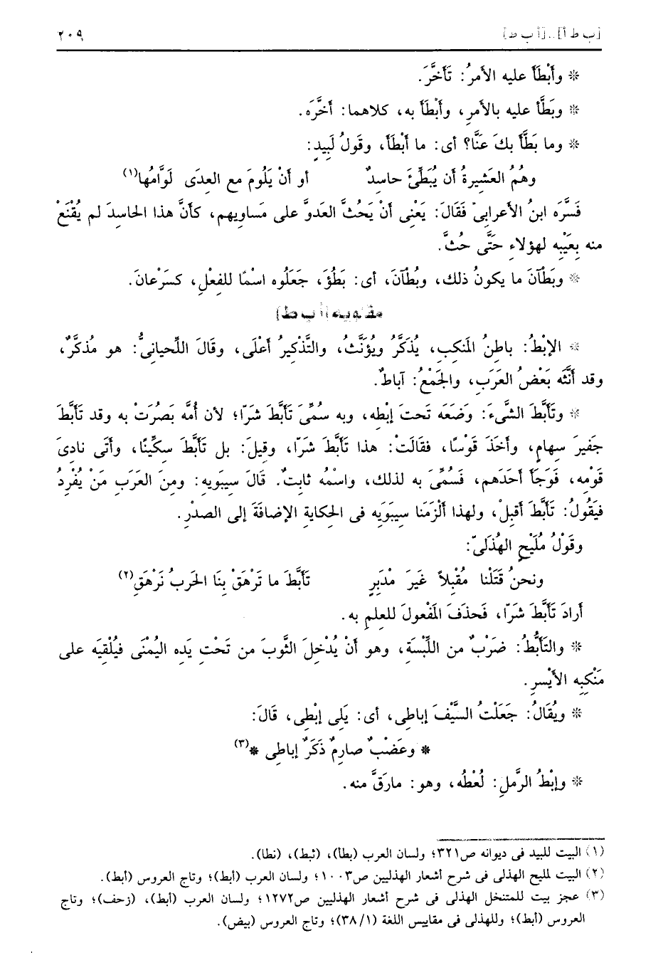 [أب ط] الإبْطُ: باطِنُ المَنكِبِ، يُذَكَّرُ ويُؤَنَّثُ، والتَّذْكِيرُ أَعْلَى، وقَالَ اللًَّحيانِيُّ: هو مُذكَّرٌ، وقد أَنَّثَه بَعْضُ العَرَبِ، والجَمْعُ: آباطٌ. وتَأَبَّطَ الشَّيءَ: وَضَعَه تَحتَ إبْطِه، وبه سُمِّيَ تَأَبَّطَ شَراّ؛ لأن أُمَّه بَصُرَتْ به وقد تَأَبَّطَ جَفيرَ سِهامِ، وأَخَذَ قَوْساً، فقَالتْ: هذا تَأَبَّطَ شَراّ، وقِيلَ: بل تَأَبَّطَ سِكِّيناً، وأَتَي نادِيَ قَوْمِه، فَوَجَأَ أَحَدَهم، فَسُمِّيَ به لذلك، واسْمُه ثابِثٌ. قَالَ سَيبَويِه: ومِنَ العَرَبِ مَنْ يُفْرِدُ فَيقُولُ: تَأَبَّطَ أَقِبلْ، ولهذا أَلْزَمنا سِيبَويَهِ في الحِكايةِ الإضافَةَ إلى الصدْرِ. وقَوْلُ مُلَيْحِ الهُذَلَِي: