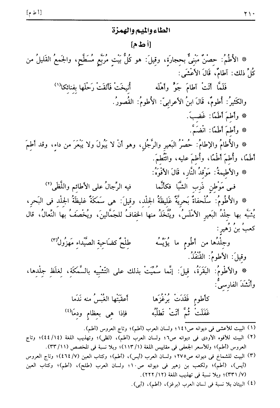 والأُطُومُ: سُلْجفاةٌ بَحرِيَّةٌ غَلِيظَةُ الجِلْدِ، وقِيلَ: هي سَمَكةٌ غليظَةً الجِلْدِ في البَحرِ، يُشَبَّه بها جِلْدُ البَعيرِ الأَمْلَسُ، ويُتَّخَذُ منها الخِفافُ للجَمَالينَ، ويُخْصَِفُ به النِّعالُ، قال كعبُ بنُ زُهيرٍ: