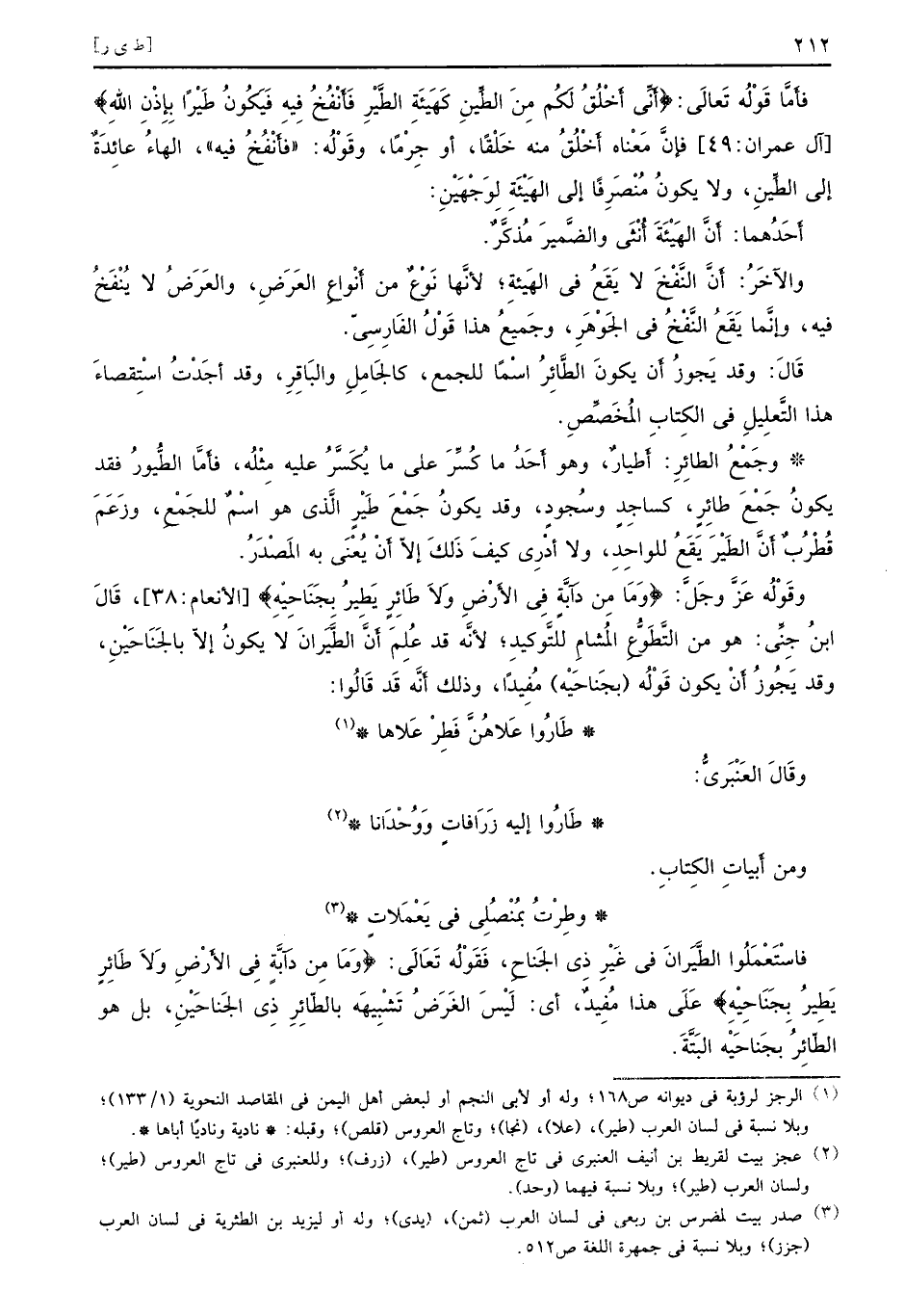 فأمَّا قَوْلُه تَعالَى: {أني أخلق لكم من الطين كهيئة الطير فأنفخ فيه فيكون طيرا بإذن الله} [آل عمران: 49] فإنَّ مَعْناه أَخْلُقُ منه خَلْقاً، أو جِرْماً، وقِوْلَه: ((فأَنْفُخُ فيه)) الهاءُ عائِدَةٌ إلى الطِّينِ، ولا يكونُ مُنْصَرِفاً إلى الهَيْئَةِ لِوَجْهَيْنِ. أَحَدُهما: أَنَّ الهَيْئَةَ أُنْثَى والضَّمٍ يرَ مُذكَّرٌ. والآخَرُ: أَنَّ النَّفْخَ لا يَقَعُ في الهَيئِة؛ لأنَّها نَوْعٌ من أَنْواعِ العَرَضِ، والعَرَضُ لا يُنْفَخُ فيه، وإنَّما يَقَعُ النَّفْخُ في الجَوْهَرِ، وجَميعُ هذا قَوْلُ الفَارِسيِّ. قَالَ: وقد يَجوزُ أَن يكونَ الطَّائِرُ اسْماً للجمع، كالجَامِلِ والبَاقِرِ، وقد أَجَدْتُ اسْتِقصاءَ هذا التَّعِليلِ في الكتابِ المُخَصِّصِ. وجَمْعُ الطائِرِ: أَطيارٌ: أَطيارٌ، وهو أَحَدُ ما كُسِّرَ على ما يُكَسَّرُ عليه مِثْلُه، فإمَّا الطُّيورُ فقد يكونُ جَمْعَ طائِرِ، كساجِدٍ وسُجودٍ، وقد يكونُ جَمْعَ طَيْرِ الَّذيِ هو اسْمٌ للجِمْعِ، وزَعَمَ قُطْرُبٌ أَنَّ الطَيْرَ يَقَعُ للواحِدِ، ولا أدْرِي كيفَ ذَلكَ إلاّ أَنْ يُعْنَِي به المَصْدَرُ. وقَوْلُه عَزَّ وجَلَّ: {وما من دابة في الأرض ولا طائر يطير بجناحيه} [الأنعام: 38] ، قَالَ ابنُ جِنِّي: هو من التَّطَوَّعِ المُشامِ للتَّوكِيدِ؛ لأنَّه قد عُلِمَ أَنَّ الطَّيَرانَ لا يكونُ إلاّ بالجَنَاحَيْنِ، وقد يَجُوزُ أَنْ يكون قَوْلُه (بجَناحَيْه) مُفِيداً، وذلك أَنَّه قَد قَالُوا: