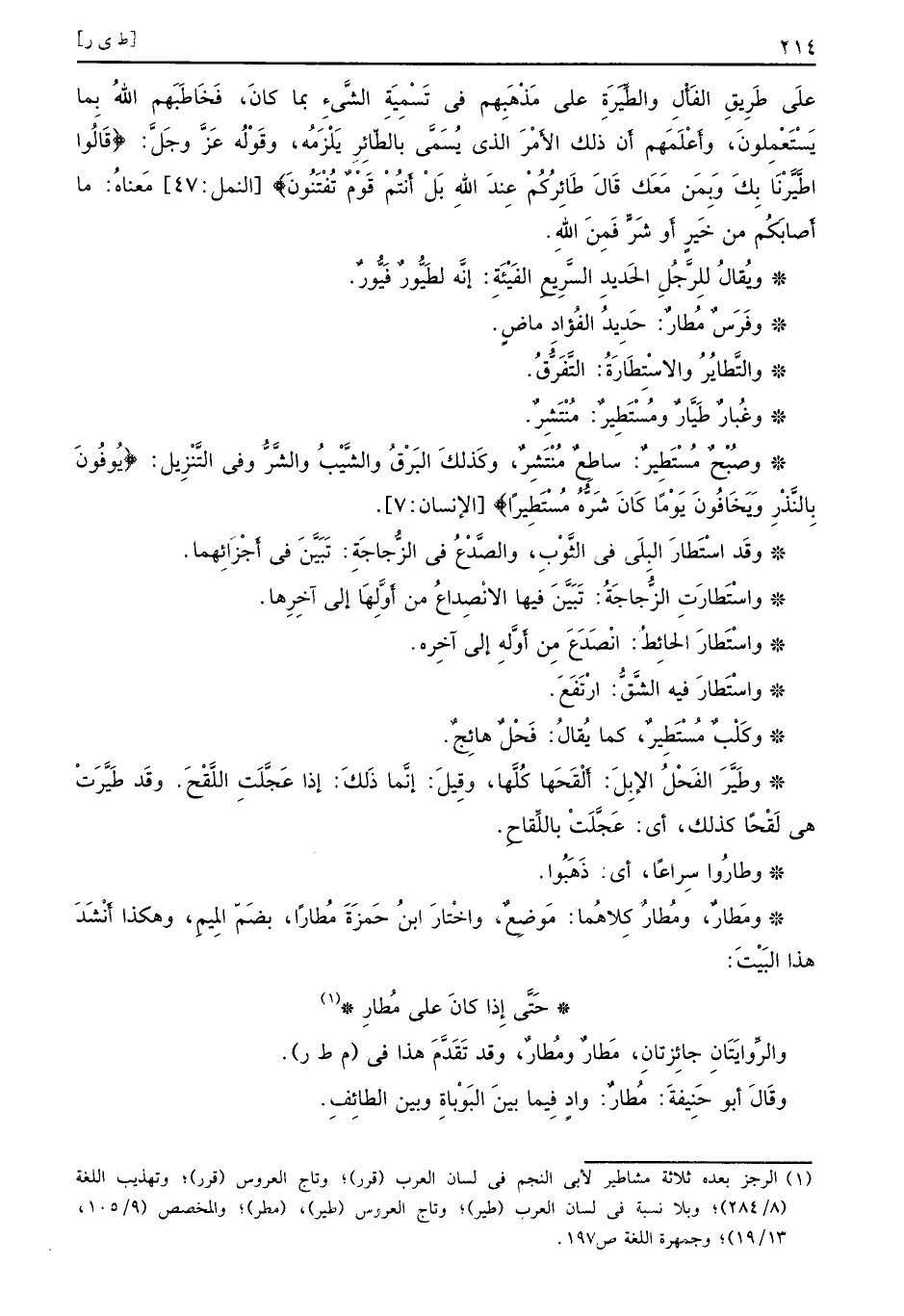 علَى طَرِيقِ الفأْل والطَّيَرِة على مَذْهَبِهم في تَسْمِيةَ الشَّيءِ بما كان، فَخَاطَبَهم اللهُ بما يَسْتْعملِونَ، وأَعْلَمَهم أَن ذلك الأَمْرَ الذي يُسَمَّي بالطّائِر يَلْزَمُه، وقَوْلُه عَزَّ وجَلَّ: {قَالُوا أطَّبَّرنا بِكَ وَبِمَنَ مَعَك قَالَ طَائِركُمْ عِندَ اللهِ بَلْ أَنْتْم قَوْمٌ تُفْتَنُونَ} [النمل: 47] مَعناهُ: ما أَصابَكُم من خَيرٍ أَو شَرِّ فَمِنَ اللهِ. ويُقالُ للِرَّجُلِ الحَديدِ السَّريعِ الفَيْئَةِ: إنَّه لطَيُّورٌ قُيُّورٌ. وفَرَسٌ مُطارٌ: حَديدُ الفُؤادِ ماضٍ. والتَّطُايُرُ والاسْتِطَارَةُ: التَّفَرُّقُ. وغُبارٌ طَيَّارٌ ومُسْتَطِيرٌ: مُنْتَشِرٌ. وصُبْحٌ مُسْتَطِيرٌ: ساطِعٌ مُنْتَشِرٌ، وكذلكَ البَرْقُ والشَّيْبُ والشَّرُّ وفي التَّنْزِيل: {يوفون بالنذر ويخافون يوما كان شره مستطيرا} [الإنسان: 7] . وقَد اسْتَطارَ البِلَي في الثَّوْبِ، والصَّدْعُ في الزُّجاجَة: تَبَيَّنَ في أَجْزَائِهما. واسْتَطارَتِ الزُّجاجَةُ: تَبَيَّنَ فيها الانْصِداعُ من أَوَّلِهَا إلى آخِرِها. واسْتَطارَ الحائِطُ: انْصَدَعَ مِن أَوَّلهِ إلى آخِره. واسْتطارَ فيه الشَّقُّ: ارْتَفَعَ. وكُلْبٌ مُسْتطِيرٌ، كما يُقالُ:؛ فَحْلٌ هائِجٌ. وطَيَّرَ الفَحْلُ الإبِلَ: أَلْقَحَها كُلَّها، وقِيلَ: إنَّما ذَلكَ: إذا عَجَّلَتِ اللَّقْحَ. وقَد طَيَّرَتْ هي لَقْحاً كذلك، أي: عَجَّلَتْ باللِّقاحِ. وطارُوا سِراعاً، أي: ذَهَبُوا. ومَطارٌ، ومُطارٌ كِلاهُما: مَوضِعٌ، واخْتارَ ابنُ حَمزَةَ مُطاراً، بضَمّ المِيمِ، وهكذا أَنْشَدَ هذا البَيتَ: