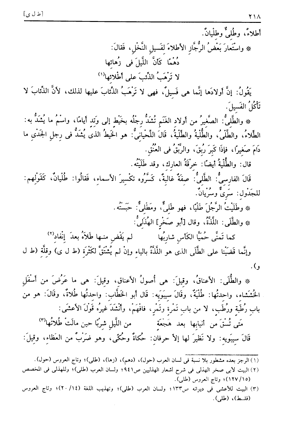 وإنَّما قَضَيْنا على الطَّلَي الذي هو اللَّذَّةُ بالياءِ وإنْ لم يُشْتَقَّ لكَثْرَةِ (ط ل ي) وقِلَّةِ (ط ل و) . والطُّلَي: الأَعناقُ، وقِيلَ: هي أُصولُ الأَعناقِ، وقِيلَ: هي ما عَرُضَ من أَسْفَلِ الخُشَشاءِ، واحِدتُها: طُلْيَةٌ، وقَالَ شِيبَويِه: قَال أَبو الخَطَّابِ: واحِدتُها طُلاةٌ، وقَالَ: هو من بابِ رُطَبةٍ ورُطِبٍ، لا من بابِ تَمْرٍ ة وتَمْرٍ، فافْهَمْ، وأَنْشَدَ غيرُه قُوْلَ الأَعشَي: