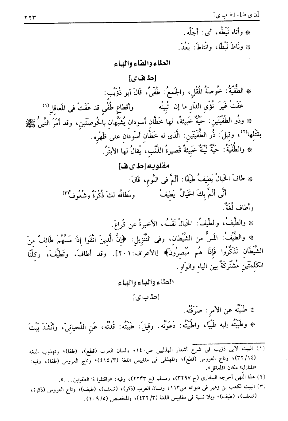 وأَطاف لُغَةٌ. والطَّيفُ، والطِّيفُ: الخَيالُ نَفْسُه، الأَخيرةُ عن كُراعَ. والطَّيْفُ: المَسُّ من الشَّيْطانِ، وفي التَّنْزيِلٍ: {إن الذين اتقوا إذا مسهم طائف من الشيطان تذكروا فإذا هم مبصرون} [الأعراف: 201] . وقد أطافَ، وتَطَيَّفَ، وكِلْتَا الكَلِمتَيَنِ مُشْتَركَةٌ بين الياءِ والوَاوِ.