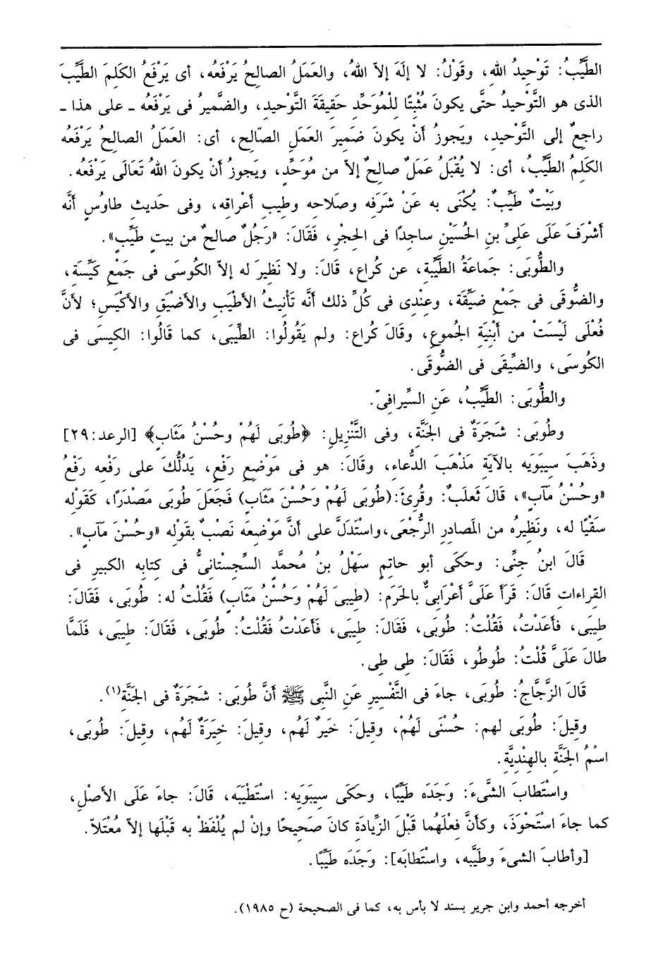 الطَّيٍّ بُ: تَوْحيدُ اللهِ، وقَوْلُ: لا إلَهَ إلاّ اللهُ، والعَمَلُ الصالِحُ يَرْفَعُه، أي يَرْفَعُ الكَلَمَ الطَّيِّبَ الذي هو التَّوْحيدُ حتَّي يكون مُثْبَتًا لِلْموَحَدِّ حَقِيقَةً التَّوْحِيدِ، والضَّميرُ في يَرْفَعُه - على هذا - راجِعٌ إلى التَّوْحِيدِ، ويِجوزُ أَنْ يكونَ ضَمِيرَ العَمَلِ الصّالحِ، أي: العَمَلُ الصالِحُ يَرْفَعُه الكَلِمُ الطَّيِّبُ، أي: لا يُقْبَلُ عَمَلٌ صالِحٌ إلاّ من مُوَحِّدٍ، ويَجوزُ أَن يكونَ اللهُ تَعَالَى يَرْفَعُه. وبُيْتٌ طَيِّبٌ: يُكْنَى به عَنْ شَرَفِه وصَلاحِه وطِيبِ أَعْراقِه، وفي حَديثِ طاوُسٍ أَنَّه أَشْرَفَ عَلَى عَلِيٍّ بنِ الحُسَيٍ ن ساجِداً في الحِجْرِ، فَقَالَ: ((رَجُلٌ صالحٌ من بيتٍ طَيِّبِ)) . والطُّوبَي: جَماعَةُ الطَّيٍٍّ ية، عن كُراع، قَالَ: ولا نَظِيرَ له إلاّ الكُوسَي في جِمْعِ كَيِّسَةِ، والضُّوقَي في جَمْعِ ضَيِّقَة، وعِنْدِي في كُلِّ ذلك أَنَّه تَأْنِيثُ الأَطْيَبِ والأَضْيَقِ والأَكْيَسِ؛ لأَنَّ فَعْلَى لَيْسَتْ من أَبْنِيةِ الجُموعِ، وقَالَ كُراع: ولم يَقُولُوا: الطِّيبي، كما قَالُوا: الكِيسَي في الكُوسَي، والضِّيقَي في الضُّوقَي. والطوبى الطيب عن السيرافي وطُوبَي: شَجَرةٌ في الجَنَّةِ، وفي التَّنْزيِلِ: {طُوَبي لَهُمْ وحُسْنُ مَئَاب} [الرعد: 29] وذَهَبَ سِيبَويَه بالآيَةَ مَذْهَبَ الدُّعاءِ، وقَِالَ: هو في مَوضْعِ رَفْعِ، يَدُلُّكَ على رَفْعِه رَفْعُ ((وحُسْنُ مَآبٍ)) ، قَالَ ثَعلَبٌ: وقُرِيَْ: (طُوبَي لَهْمْ وَحْسْنَ مَئَابِ) فَجَعَلِ طُوَبي مَصْدراً، كَقَولْهٍ سَقْياً له، ونَظِيرُه من المَصادِرِ الرُّجَعَي، واسْتَدَلَّ على أَنَّ مَوْضِعَه نَصْبٌ بقَوِلْه ((وحُسْنَ مَآب)) . قَالَ ابنُ جِنَّي: وحَكَي أبو حاتِمٍ سَهْلُ بنُ مُحمَّدٍ السِّجِسْتانِيُّ في كتِابِه الكبيرِ في القِراءات قَالَ: قَرَأَ عَلَىَّ أَعْرَابِيٌّ بالحَرَم: (طِيبيَ لَهُمْ وَحُسْنُ مَئَابٍ) فَقُلْتُ له: طُوبَي، فَقَالَ: طِيبَي، فأَعَدْتُ، فَقُلْتُ: طُوبَي، فَقَالَِ: طِيبَي، فَأَعَدْتُ فَقُلْتُ: طُوبَي، فَقَالَ: طِيبَي، فَلَمَّا طالَ عَلَىّ قُلْتُ: طُوطُو، فَقَالَ: طيِ طيِ. قَالَ الزَّجَّاجُ: طُوبَي، جاءَ في التَّفْسِيرِ عَنِ النَّبِي صلى الله عليه وسلم أَنَّ طُوبَي: شَجَرةٌ في الجَنَّةِ. وقِيلَ: طُوبَي لهم: حُسْنَي لَهُمْ، وقِيلَ: خَيرٌ لَهْم، وقِيلَ: خِيَرَةٌ لَهْم، وقِيلَ: طُوبَي، اسْمُ الجَنَّةِ بالهِنْدِيَّةِ. واسْتَطابَ الشَّيءَ: وَجَدَه طَيِّباً، وحَكَى سِيبَويَه: اسْتَطْيَبَه، قَالَ: جاءَ عَلَى الأَصْلِ، كما جاءَ اسْتَحْوَذَ، وكأَنَّ فِعْلَهُما قَبْلَ الزِّيادَةِ كانَ صَحِيحاً وإنْ لم يُلْفَظْ به قَبْلَها إلاّ مُعْتَلاً. [وأطابَ الشيءَ وطَيَّبه، واسْتطابَه] : وَجَدَه طَيِّباً.