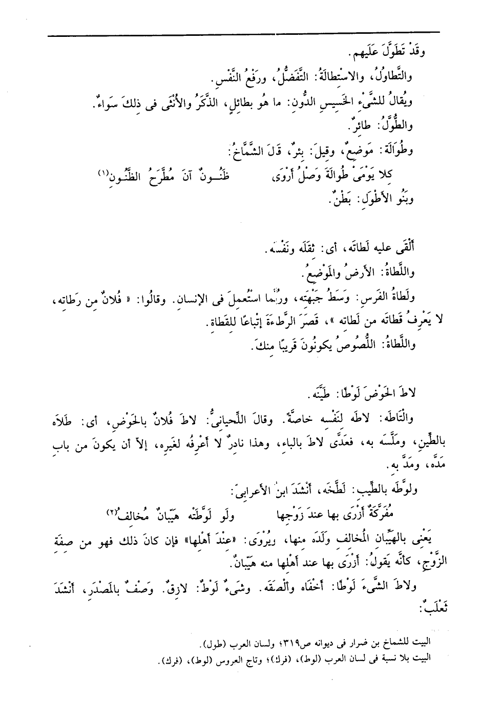 [ل وط] لاطَ الحَوْضَ لَوْطاً: طَيَّنَه. والَتَاطَه: لاطَه لِنَفْسِه خاصَّةً. وقالَ اللِّحيانِيُّ: لاطَ فُلانٌ بالحَوْضِ، أي: طَلاَه بالطِّينِ، ومَلَّسَه به، فعَدَّي لاطَ بالباءِ، وهذا نادِرٌ لا أَعْرِفُه لغَيرِه، إلاّ أن يكونَ من بابِ مَدَّه، ومَدَّ بهِ. ولوَّطَه بالطِّيب: لَطَّخَه، أَنْشَدَ ابنُ الأَعرابِيّ: