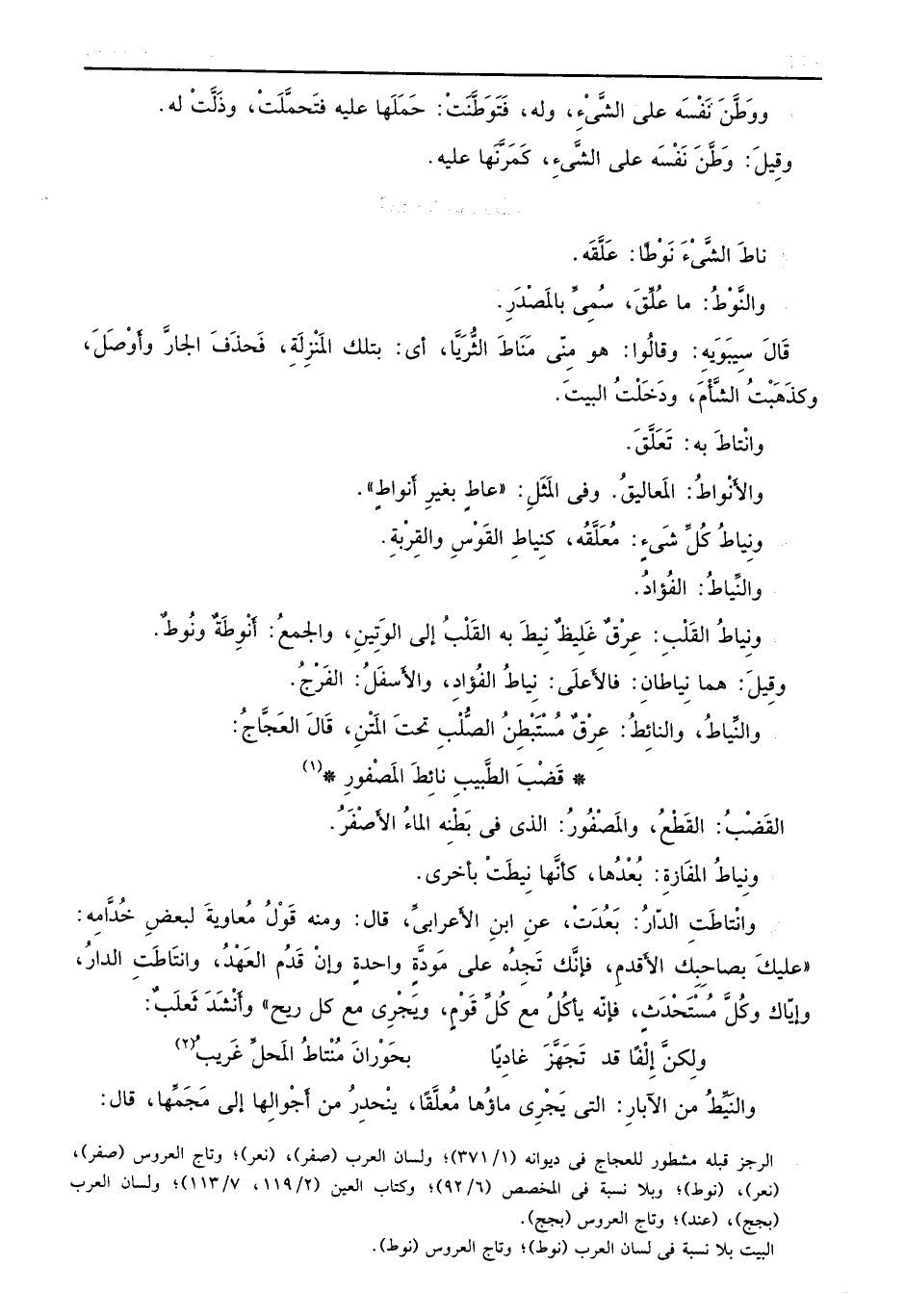 [ن وط] ناطَ الشَّيْءَ نَوْطاً: عَلَّقَه. والنَّوْطُ: ما عُلَّقَ، سُمِيِّ بالمَصْدَرِ. قَالَ سِيبَويَه: وقالُوا: هو مِنّي مَنَاطَ الثُّرَيَّا، أي: بتلك المَنْزِلَةِ، فَحذَفَ الجارَّ وأَوْصَلَ، وكذَهَبْتُ الشَّأْم، ودَخَلْتُ البيتَ. وانْتاطَ به: تَعَلَّقَ. والأَنْواطِ: المَعاليقُ: وفي المَثَلِ: ((عاطٍ بغيرِ أَنواطٍ)) . ونيِاطُ كُلِّ شَيءٍ: مُعَلَّعُه، كنِياطِ القَوْسِ والقَرْبِة. والنِّياطُ: الفُؤادُ. ونِياطُ القَلْبِ: عِرْقٌ غَلِيظُ نِيطَ به القَلْبُ إلى الوَتِينِ، والجمعُ: أَنْوِطَةٌ ونُوطٌ. وقِيلَ: هما نِياطانِ: فالأَعَلى: نِياطُ الفُؤادِ، والأَسفَلُ: الفَرْجُ. والنِّياطُ، والنائِطُ: عِرْقٌ مُسْتَبْطِنُ الصُّلْبِ تحتَ المَتْنِ، قَالَ العَجَّاجُ: