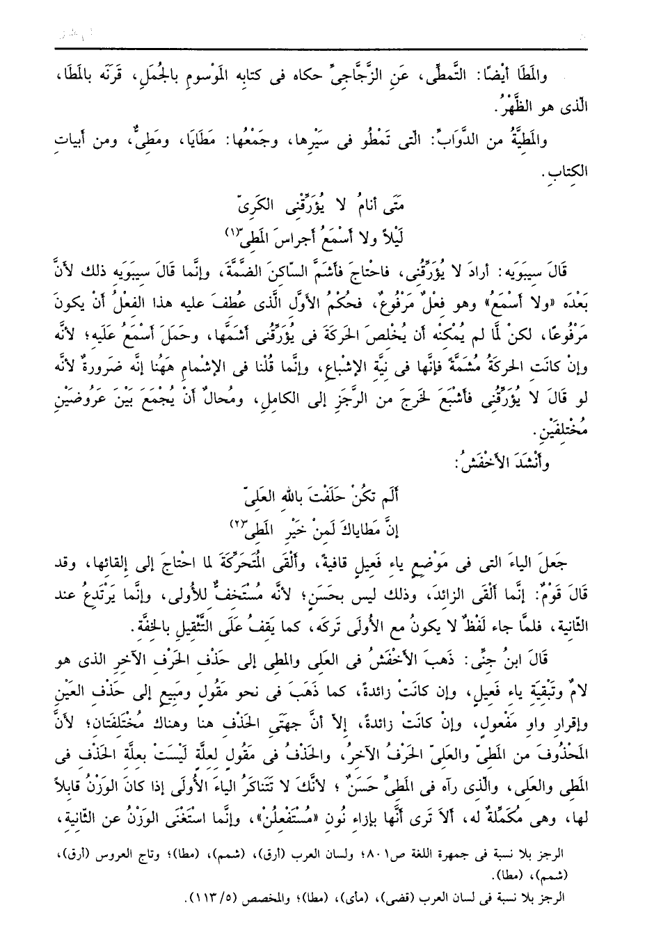 جَعَلَ الياءَ التي في مَوْضِعِ ياءِ فَعِيلِ قافيةً، وأَلْقَي المُتَحَرِّكَةَ لما احتْاجَ إلى إِلقائِها، وقد قَالَ قَوْمٌ: إنَّما أَلْقَي الزائِدَ، وذلك ليس بحَسَنٍ؛ لأنَّه مُسْتَخِفٌّ لِلأُولِي، وإنَّما يَرْتَدِعُ عند الثّانِية، فلماَّ جاء لَفْظٌ لا يكونُ مع الأُولَي تَركَه، كما يَقِفُ عَلَى التثَّقْيِلِ بالخِفَّةِ. قَالَ ابنُ جِنَّي: ذَهبَ الأَخْفَشُ في العَلِي والمطِي إلى حَذْفِ الحَرْفِ الآخِرِ الذي هو لامٌ وتَبْقِيَة ياءِ فَعِيلٍ، وإن كانَتْ زائدةُ، كما ذَهَبَ في نحو مَقُولٍ ومِبيعٍ إلى حَذْفِ العَيْنِ وإقرارِ واوِ مَفْعولٍ، وإنْ كانَتْ زائدةً، إِلاّ أنَّ جهَتَي الحَذْفِ هنا وهناك مُخْتَلِفَتانٍِ؛ لأَنَّ المَحْذُوفَ من المَطِيّ والعَلِيّ الحَرْفُ الآخِرُ، والحَذْفُ في مَقُولٍ لًعلِةِ لَيْسَتْ بِعلَّةِ الحَذْفِ في المَطِي والعَلِي، والّذِي رآه في المَطِيِّ حَسّنٌ، لأنَّكَ لا تَتَناكَرُ الياءَ الأُولَي إذا كانَ الوَزْنُ قابِلاً لها، وهي مُكَمِّلَةٌ له، أَلاَ تَرى أَنَّها بإزاءِ نَونِ ((مُسْتفْعِلُنْ)) ، وإنَّما اسْتَغْنَى الوَزْنُ عن الثّانِيةِ،