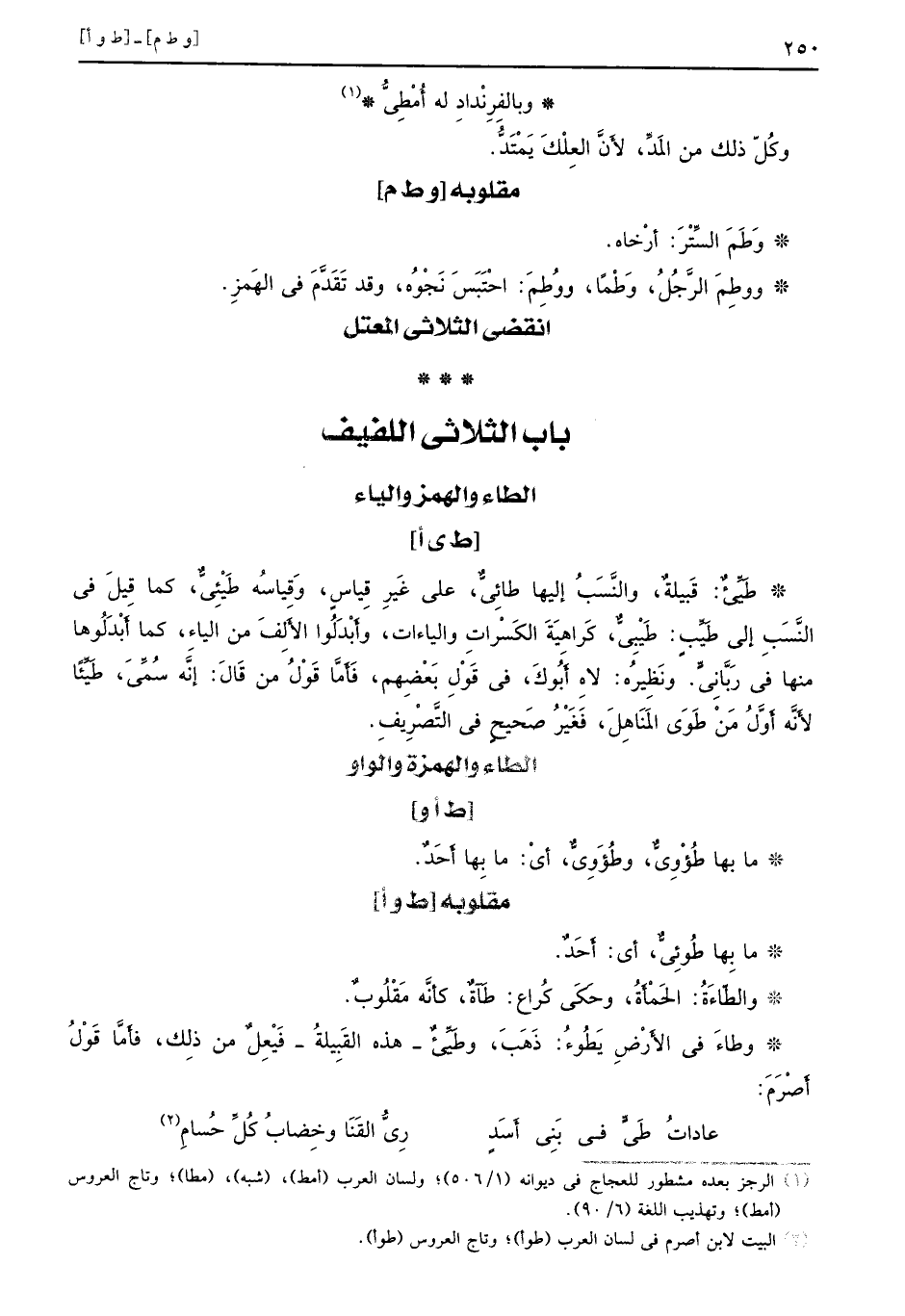 [ط وأ] ما بِها طُوِئيُّ، أي: أًَحَدٌ. والطّاءةُ: الحَمْأَةُ، وحَكَى كُراع: طَآةٌ، كأنَّه مَقْلُوبٌ. وطاءَ في الأَرْضِ يُطُوءُ: ذَهَبَ، وطَيِّيءٌ _ هذه القِبِيلةُ - فَعْيِلٌ من ذَلك، فأََمَّا قَوْلُ أَصْرَمَ: