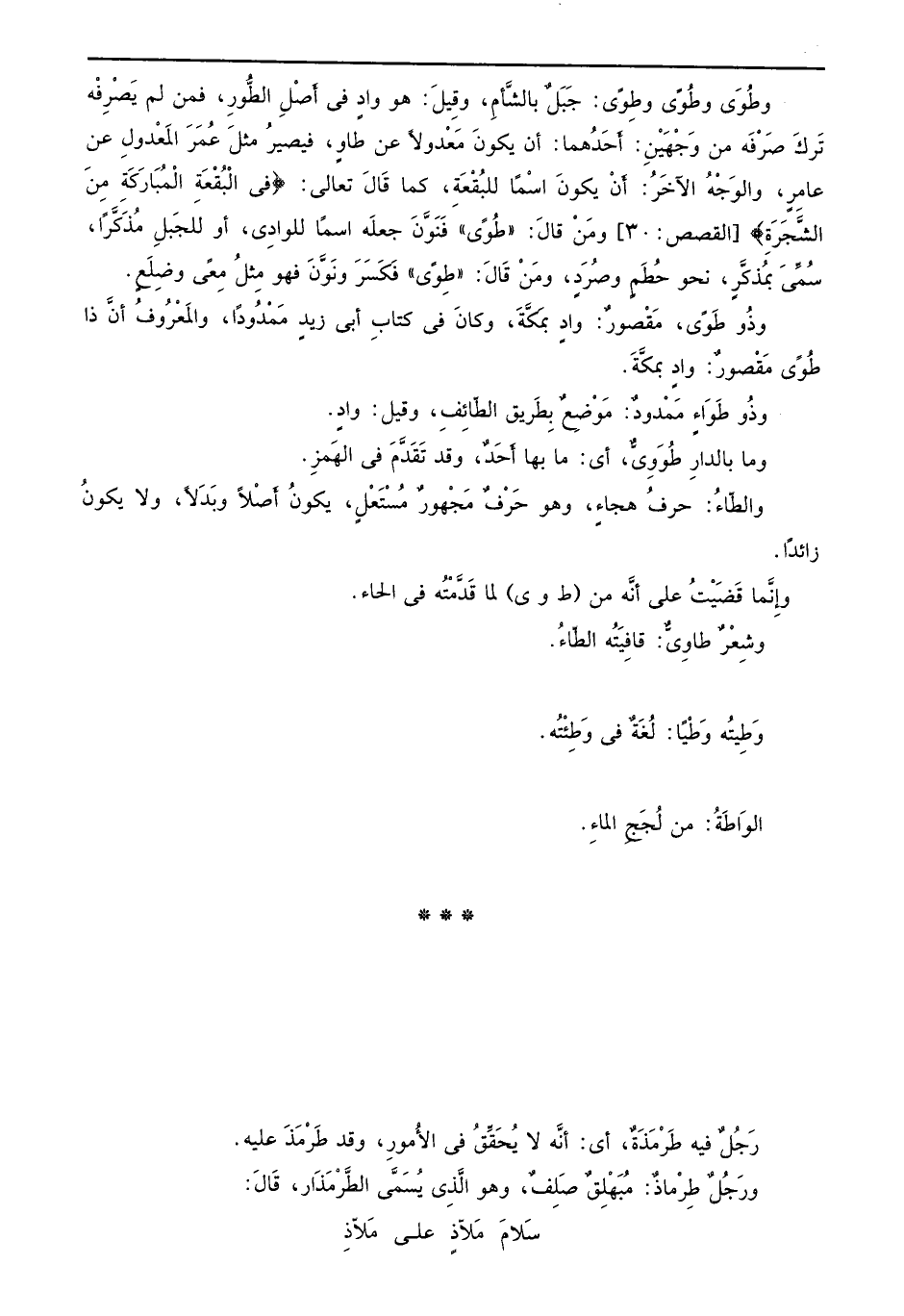 وطُوَى وطُوًى وطِوًى: جَبَلٌ بالشَّأمِ، وقِيلَ: هو وادٍ في أًصْلِ الطُّورِ، فمن لم يَصْرِِفْه تَركَ صَرْفَه من وَجْهَيْنِ: أَحَدُهما: أن يكونَ مَعْدولاً عن طاوٍ، فيصيرُ مثلَ عُمَرَ المَعْدولِ عن عامِر، والوَجُهُ الآخَرُ: أَنْ يكونَ اسْماً للبُقَعَةِ، كما قَالَ تعالى: {في الْبٌ قْعَةِ المْبُاَرَكَة مِنَ الشَّجَرَةِ} [القصص: 30] ومَنْ قالَ: ((طوًى)) فَنَوَّنَ جعلَه اسماً للوادِي، أو للجَبلِ مُذَكَّراً، سُمِّيَ بمُذكَّرٍ، نحو حُطَمٍ وصُرَدٍ، ومَنْ قَالَ: ((طِوًى)) فَكَسَرَ ونَوَّنَ فهو مِثلُ مِعَى وضِلَعِ. وذُو طَوًى، مَقْصورٌ: وادٍ بمكَّةَ: وكانَ في كتابِ أبي زيدٍ مَمْدُوداً، والمَعْرُوفُ أنَّ ذا ? طُوًى مَقْصورٌ: وادٍ بمكَّةَ. وذُو طَوَاءٍ مَمْدودٌ: مَوْضِعٌ بِطَريق الطّائِفِ، وقيل: وادٍ. وما بالدارِ طُوَوَيٌّ، أي: ما بها أَحَدٌ، وقد تَقَدَّمَ في الهَمزِ. والطّاءُ: حرفُ هجاءِ، وهو حَرْفٌ مَجْهورٌ مُسْتَعْلٍ، يكونُ أَصْلاً وبَدَلاً، ولا يكونُ زائداً. وإِنَّما قَضَيْتُ على أنَّه من (ط وي) لما قَدَّمْتُه في الحاء. وشِعْرٌ طاوِيٌّ: قافِيتُه الطّاءُ.