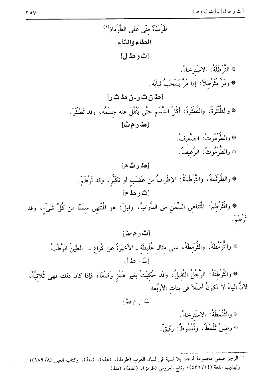 [ط ر م ث] والطُّرْمُوثُ: الضَّعِيفُ. والطُّرْمُوثُ: الرَّغِيفُ. [ط ر ث م] والطَّرْثَمةُ، والثَّرْطَمَةُ: الإطْرافُ من غَضَبِ أو تكَبُّرِ، وقد ثَرْطَمَ. [ث ر ط م] والمثرمط المتناهي السمن من الدواب وقيل: هو المنتهى سمناً من كل شيء، وقد ثرطمَ [ث ر م ط] والثُّرْمُطَةُ، والثُّرَمِطَةُ، على مِثالِ عُلَبِطَةٍ - الأَخيرةُ عن كُراع -: الطِّينُ الرَّطْبُ.