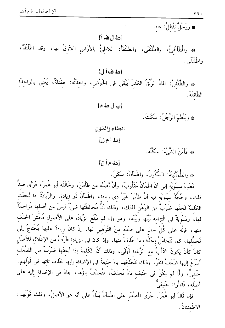 [ط أم ن] طَأْمَنَ الشَّيءَ: سَكَّنَه. [ط م أن] والطُّمَأْنِينَةُ: السُكُونُ، وأطْمَأَنَّ: سَكَنَ! . ذَهَبَ سِيبَويَهْ إلى أَنَّ أطْمَأَن مَقْلُوبٌ، وأَنَّ أَصْلَه من طَأْمَنَ، وخَالَفَه أَبو عُمَر، فَرأَى ضِدَّ ذلك، وحُجَّةُ سِيْبَويِهْ فيه أَنْ طَأَمْن غَيْرُُ ذِي زِيادةٍ، واطْمَأَنَّ ذُو زِيادةٍ، والزِّيادَةُ إذا لَحِقَتِ الكَلِمَةَ لَحقَها ضَرْبٌ من الوَهِنِ لذلك، وذلك أَنَّ مُخالَطَتَها شَيءٌ ليسَ من أَصلِها مُزاحمَةُ لها، وتَسْوَِيَةٌ في الَتزِامه بَيْنَها وَبيْنَه، وهو وإن لم تَبْلُغِ الزَّيادَة على الأُصولِ فُحْشَ الحَذْفِ منها، فإنَّه على كُلِّ حالٍ على صَدَدٍ مِنَ التَّوْهِينِ لها، إذْ كانَ زِيادةً عليها يُحْتاجُ إلى تَحمُّلِها، كما تَتَحامَلُ بِحَذْفِ ما حُذِفَ منها، وإذا كان في الزيادةِ طَرَفٌ من الإعْلالِ للأَصْلِ كانَ كأَنْ يكونَ القَلْبُ مع الزِّيادةِ أَوْلَى، وذلك أَنَّ الكَلِمةَ إذا لَحِقَها ضَرْبٌ من الضَّعْفِ أَسْرَعَ إليها ضَعْفٌ آخَرُ، وذلك كَحَذْفَهم ياءَ حَنِيفةَ في الإضافةِ إليها لحَذفِ تائِها في قَوْلِهم: حَنَفِيٌّ، ولمَّا لم يكُنْ في حَنِيفٍ تاءٌ تَخذَفُ، فُتخذَفُ ياؤُها، جاءَ في الإضافةِ إِليه على أَصْلِه، فَقالُوا: حَنِيفٌّ ي. فإن قَالَ أبو عُمَرَ: جَرْى المَصْدَرِ على اطْمأَنَّ يَدُلُّ على أَنّه هو الأَصلُ، وذلك قَوْلُهم: الاطْمِئنانُ.