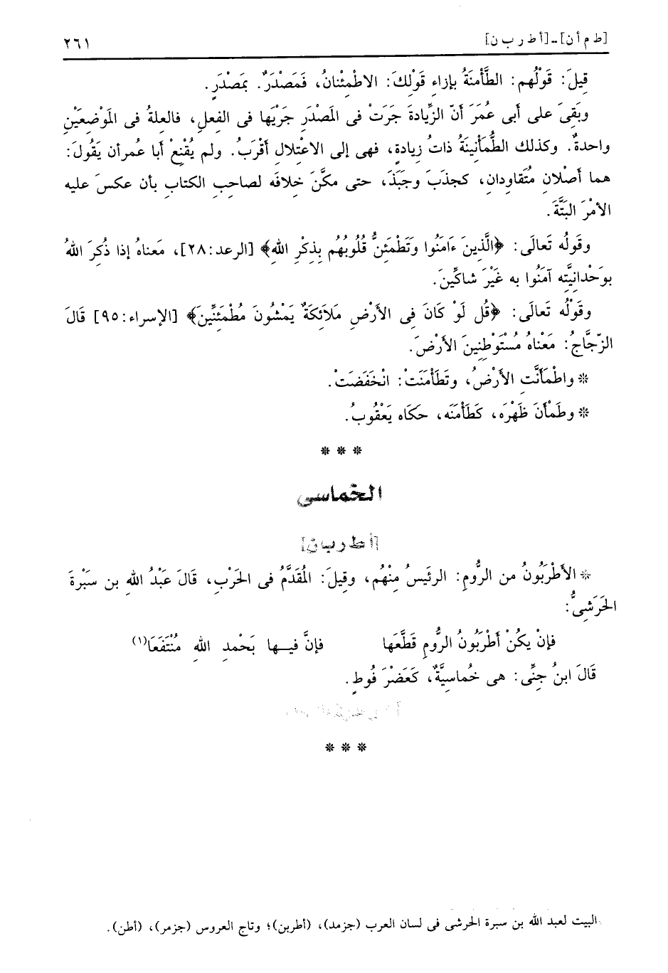 قِيلَ: قَوْلُهم: الطَّأْمَنةُ بإزاءِ قَوْلِكَ: الاطْمِئْنانُ، فَمَصْدَرٌ. بَمصْدَرٍ. وبَقَيَ على أَبي عُمَرَ أَنّ الزِّيادةَ جَرَتْ في المَصْدَرِ جِرْيَها في الفِعلِ، فالعِلةُ في المَوْضِعَيْنِ واحدةٌ. وكذلك الطُّمَأْنينَةُ ذاتُ زِيادة، فهي إلى الاعْتِلال أَقْرَبُ. ولم يُقْنعْ أَبا عُمرأن يَقُولَ: هما أَصْلاِن مُتَقاودانِ، كجذَبَ وجَبَذَ، حتى مكَّنَ خِلافَه لصاحِبِ الكتابِ بأن عكسَ عليه الأمْرَ البَتَّةَ. وقَولُه تَعالَى: {الَّذِينَءَامَنُوا وتَطْمَئِنُّ قُلُوبُهمُ بِذِكْرِ الله} [الرعد: 28] ، معناهُ إذا ذُكِرَ اللهُ بوَحْدانِيِتَّه آمَنُوا به غَيْرَ شاكِّينَ. وقَوْلُه تَعَالى: {قل لو كان في الأرض ملائكة يمشون مطمئنين} [الإسراء: 95] قَالَ الزّجَّاجُ: مَعْناهُ مُسْتَوْطِنِينَ الأَرْضَ. واطْمَأَنَّتِ الأَرْضُ، وتَطَأَمَنَتْ: انْخَفَضَتْ. وطَمْأَنَ ظَهْرَه، كَطَأَمَنَه، حَكَاه يَعْقُوبُ.