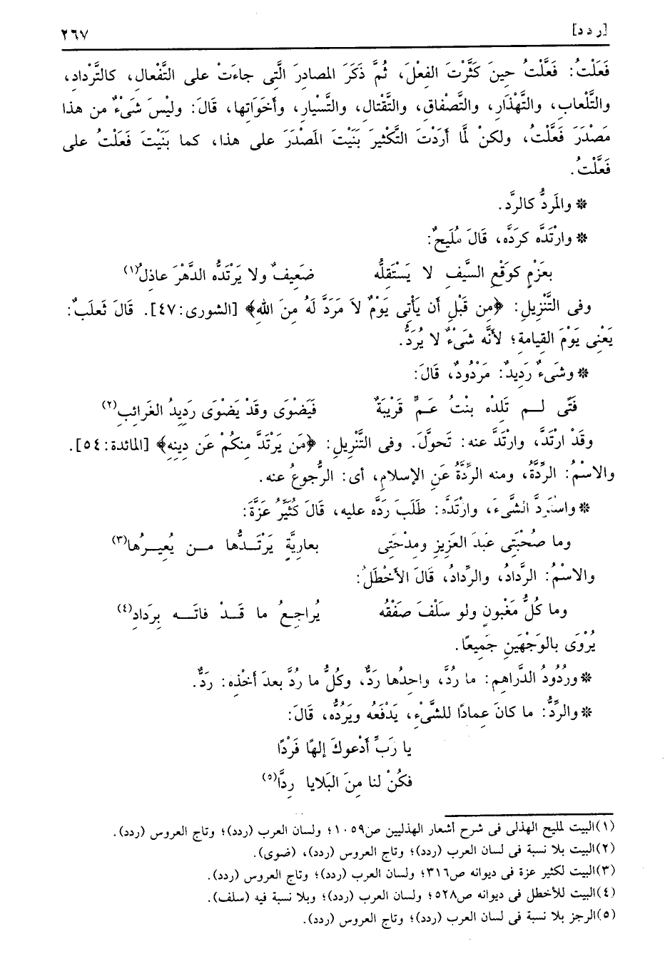 فَعَلْتُ: فَعَّلْتُ حِينَ كَثَّرْتَ الفِعْلَ، ثُمَّ ذَكَرَ المصادِرَ الَّتِي جاءَتْ على التَّفْعالِ، كالتَّرْدادِ، والتَّلْعابِ، والتَّهْذَارِ، والتَّصْفاقِ، والتَّقْتالِ، والتَّسْيارِ، وأَخَوَاتِها، قَالَ: وليْسَ شَيْءٌ من هذا مَصْدَرَ فَعَّلْتُ، ولكنْ لََّما أَرَدْتَ التَّكْثيرَ بَنْيْتَ المَصْدَرَ على هذا، كما بَنَيْتَ فَعَلْتُ على فَعَّلْتُ. والمَردُّ كالرَّد. وارْتَدَّه كرَدَّه، قَالَ مُلِيحٌ.