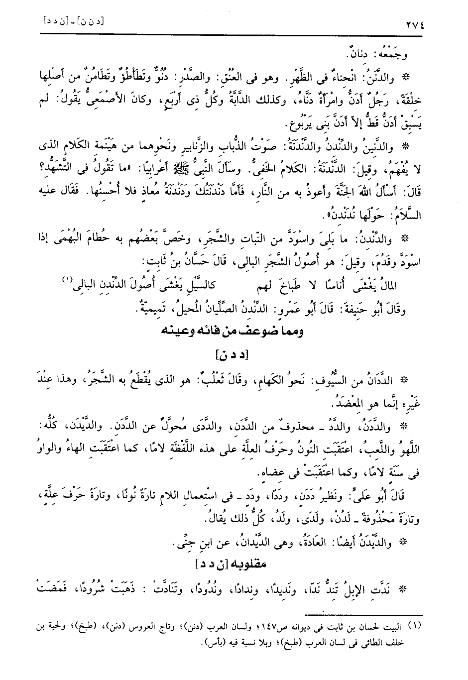 [د د ن] الدَّدَانُ من السُّيُوفِ: نَحوُ الكَهامِ، وقَالَ ثَعْلُبٌ: هو الذي يُقْطَعُ له الشَّجَرُ، وهذا عِنْدَ غَيْرِه إنَّما هو المِعْضَدُ. والدَّدَنُ، والدَّدُ - محذوفٌ من الدَّدَنِ، والدَّدَى مُحوَّلٌ عن الدَّدَنِ. والدَّيْدَن، كُلُّه: اللَّهُو واللَّعِبُ، اعْتَقَبَتِ النُونُ وحَرْفُ العِلَّةِ على هذه اللَّفْظَةِ لاماً، كما اعْتَقَبَتِ الهاءُ والواوُ في سَنَة لاماً، وكما اعْتَقَبَتْ في عِضاهٍ. قَالَ أَبُو عَليٍّ،: ونَظيرُ دَدَنٍ، ودَداً، ودَدٍ - في اسْتِعمالِ اللامِ تارَةً نُوناً، وتارَةً حَرْفَ عِلَّةٍ، وتارَةً مَحْذُوفةً - لَدُنْ، ولَدَى، ولَدُ، كُلُّ ذلك يُقالُ. والدَّيْدنَ أَيضاً: العَادَةُ، وهي الدَّيْدانُ، عن ابنِ جِنَّي