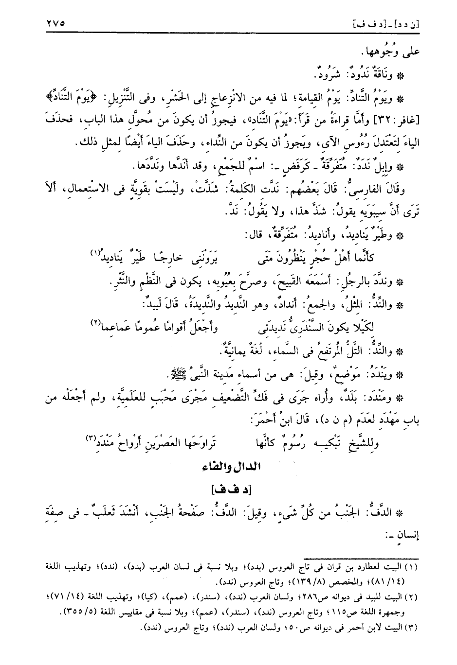على وُجُوهها. ونَاقَةٌ نَدُودٌ: شَرُودٌ. ويَوْمُ التَّنادِّ: يَوْمُ القِيامةِ؛ لما فيه من الانْزِعاجِ إلى الحَشْرِ، وفي التَّنْزِِيلِ: {يوم التناد} [غافر: 32] وأَمَّا قِراءةُ من قَرَأَ: ((يَوْمَ التَّنَادِ)) ، فيجوزُ أن يكونَ من مُحوَّلِ هذا البابِ، فحذَفَ الياءَ لِتَعْتَدِلَ رُءُوسِ الآيِ، وَيجوزُ أن يكونَ من النِّداءِ، وحَذَفَ الياءَ أَيْضاً لمِثلِ ذلك. وإِبِلٌ نَدَدٌ: مُتَفَرِّقَةُ - كَرَفَضٍ -: اسْمٌ للجَمْعِ، وقد أَنَدَّها ونَدَّدَها. وقَالَ الفارِسِيٌّ: قَالَ بَعْضُهم: نَدَّتِ الكَلِمةُّ: شَذَّتْ، ولَيْسَتْ بقَوِيَّةٍ في الاسْتِعمالِ، أَلاَ تَرَى أَنَّ سِيبَويِهِ يقولُ: شَذَّ هذا، ولا يَقُولُ: نَدَّ. وطَيْرٌ يَنادِيدُ، وأَنادِيدُ: مُتَفَرَّقةٌ، قال: