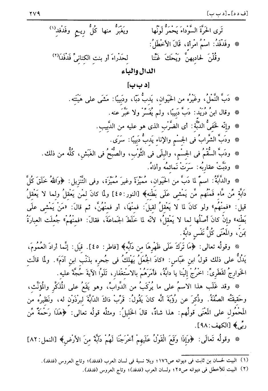 [د ب ب] دَبَّ النَّمْلُ، وغَيْرُه من الحَيَوانِ، يَدِبُّ دَبّا، ودَبِيباً: مَشَى على هَيْنَتِه. وقال ابنُ دُرَيْدٍ: دَبَّ دَبِيباً، ولم يُفَسِّرْ ولا عَبَّرَ عنه. وإِنّه لخَفِيُّ الدِّبَّة: أي الضَّرْبِ الذي هو عليه من الدَّبِيبِ. ودَبَّ الشَّرابُ في الجِسْمِ والإناءِ يَدِبُّ دَبِيباً: سَرَى. ودَبَّ السُّقْمُ في الجِسْمِ، والبِلَى في الثَّوْبِ، والصُّبْحُ في الغَبَشِ، كُلُّه من ذلك. ودَبَّتْ عقارِبُه: سَرَتْ نَمائِمُه وأذاهُ. والدَّابَّةُ: اسمٌ لما دَبَّ من الحَيَوانِ، مُمَيِّزَةً وغيرَ مُمَيِّزًَةَ، وفي التَّنِزِيلِ: {والله خلق كل دابة من ماء فمنهم من يمشي على بطنه} [النور: 45] ولّما كانَ لِمْن يَعْقِلُ ولِما لا يَعْقِلُ قيل ((فمنهم)) ولو كان لما لا يعقل لِقيلَ: فمِنْهَا، أو فمِنْهُنَّ، ثم قالَ: ((مَنْ يَمْشِي علَى بَطْنِه)) وإنْ كانَ أَصْلُها لمِا لا يَعْقِلُ؛ لأنّه لما خَلَطَ الجَماعَةَ، فقالَ: ((فمِنْهُمْ)) جُعِلَت العِبارَةُ بمَنْ، والمَعْنَى كُلُّ نَفْسٍ دابَّةِ. وقولُه تعالى: {ما ترك على ظهرها من دابة} [فاطر: 45] . قِيل: إنَّما أرادَ العُمُومَ، يَدُلُّ على ذلك قولُ ابنِ عَبّاس: ((كادَ الجُعَلُ يَهْلِكُ في جَحِره بذَنْبِ ابنِ آدَمَ)) . ولّما قالَتِ الخَوارِجُ لقَطَرِىِّ: اخْرُجْ إِلينْا يا دابَّةُ، فأَمَرَهُمْ بالاسْتِغْفارِ، تَلَوُا الآيةَ حُجَّةً عليه. وقد غَلَب هذا الاسمُ على ما يُرْكَبُ من الدَّوابِّ، وهو يَقَعُ على المُذكَّرِ والُمؤَنَّثِ، وحَقِيقَتُه الصِّفَةُ. وذُكِرَ عن رُؤْبَةَ أنَّه كانَ يَقُولُ: قَرِّبْ ذاكَ الدّابَّةَ لِبرْذَوْنٍ له، ونَظِيرُه من المَحْمُول على المَعْنَى قولُهم: هذا شاةٌ، قالَ الخَلِيلُ: ومثلُه قولُه تعالى: {هذا رحمة من ربي} [الكهف: 98] . وقولُه تَعالَى: {وإذا وقع القول عليهم أخرجنا لهم دابة من الأرض} [النمل: 82]