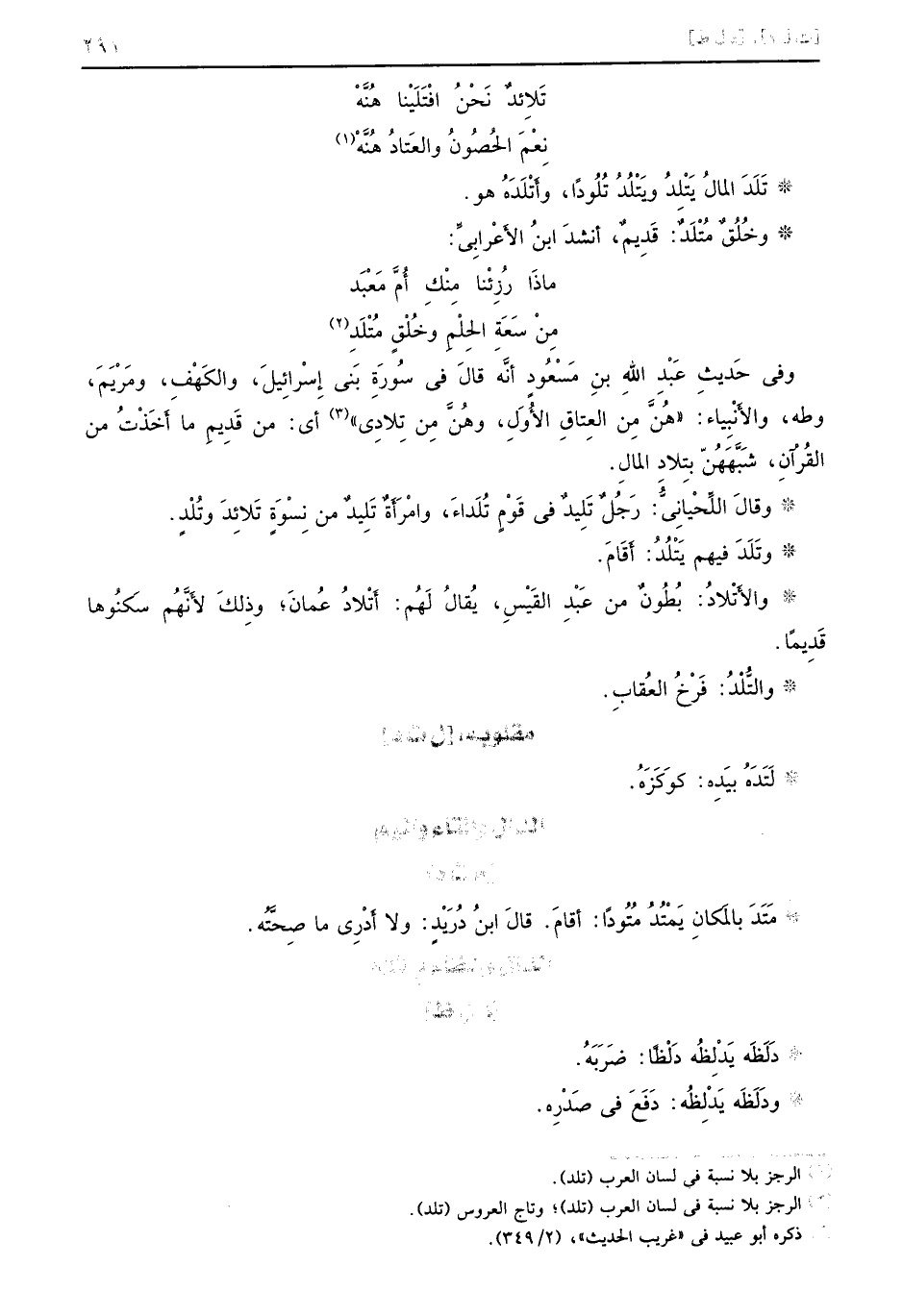 وفي حَديثِ عَبْدُ اللهِ بنِ مَسْعُودِ أنَّه قالَ في سُورَةِ بَني إِسْرائِيلَ، والكَهْفِ، ومَرْيَمَ، وطه، والأَنِبياء: ((هُنَّ مِن العِتاقِ الأُوَلِ، وهُنَّ مِن تِلادِي)) أي: من قِدِيم ما أَخَذْتُ من القُرْآنِ، شَبَّهَهُنّ بِتلادِ المالِ. وقالَ اللِّحْيانِيُّ: رَجُلٌ تَلِيدٌ في قَوْمٍ تُلَداءَ، وامْرَأَةٌ تَلِيدٌ من نِسْوَةٍ تَلائِدَ وتُلْدٍ. وتَلَدَ فيهم يتْلُدُ: أَقَامَ. والأَتْلادُ: بُطُونٌ من عَبْدِ القَيْسِ، يُقالُ لَهُم: أَتْلادُ عُمانَ؛ وذِلكَ لأَنَّهُم سَكنُوها قِديماً. والتُّلْدُ: فَرْخُ العُقابِ.