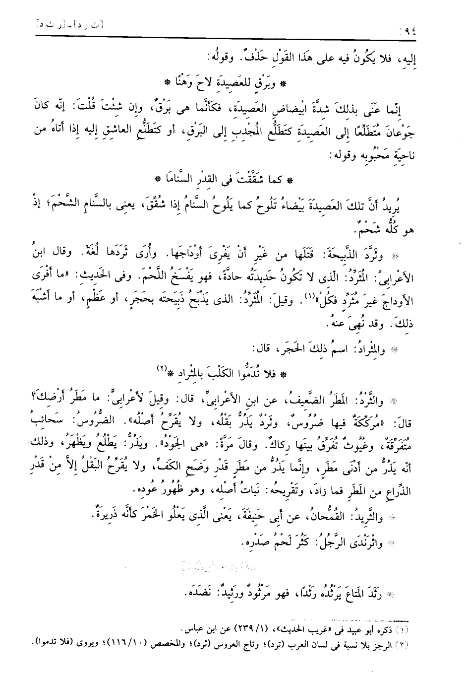 يُريدُ أَنَّ تلكَ العَصِيدَة بَيْضاءُ تَلُوحُ كما يَلُوحُ السَّنامِ إِذا شُقِّقَ، يعِني بالسَّنامِ الشَّحْمَ؛ إذْ هو كُلُّه شَحْمٌ. وثَرَّدَ الذَّبِيحَةَ: قَتَلَها من غَيْرِ أَنْ يَفْرِىَ أَوْدَاجَها. وأُرَى ثَرَدَها لُغَةً. وقال ابنُ الأَعْرابِيِّ: المُثَرِّدُ: الّذِي لا تَكُونُ حَدِيدَتُه حادَّةً، فهو يَفْسَخُ اللِّحْمَ. وفي الحَديِثِ: ((ما أَفْرَى الأَوداجَ غيرَ مُثَرِّدٍ فكُلْ)) . وقيلَ: المُثَرِّدُ: الذي يَذْبَحُ ذَبِيَحتَه بحجَرٍ، أو عَظْمٍ، أو ما أَشْبَهَ ذلٍِ كَ، وقد نُهِى عنهُ. والمِثْرادُ: اسمُ ذِلكَ الحَجَر، قال: