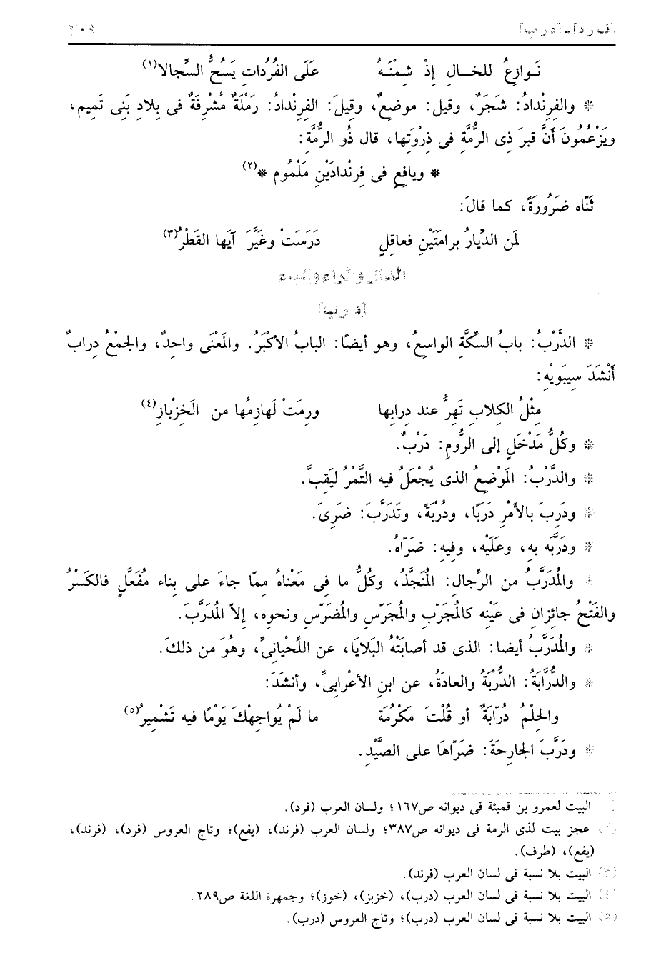 [د ر ب] الدَّرْبُ: بابُ السِّكَّةِ الواسِعُ، وهو أيضاً: البابُ الأَكْبَرُ. والمَعْنَى. واحِدٌ، والجمْعُ درابٌ أَنْشَدَ سِيبَويْهَ: