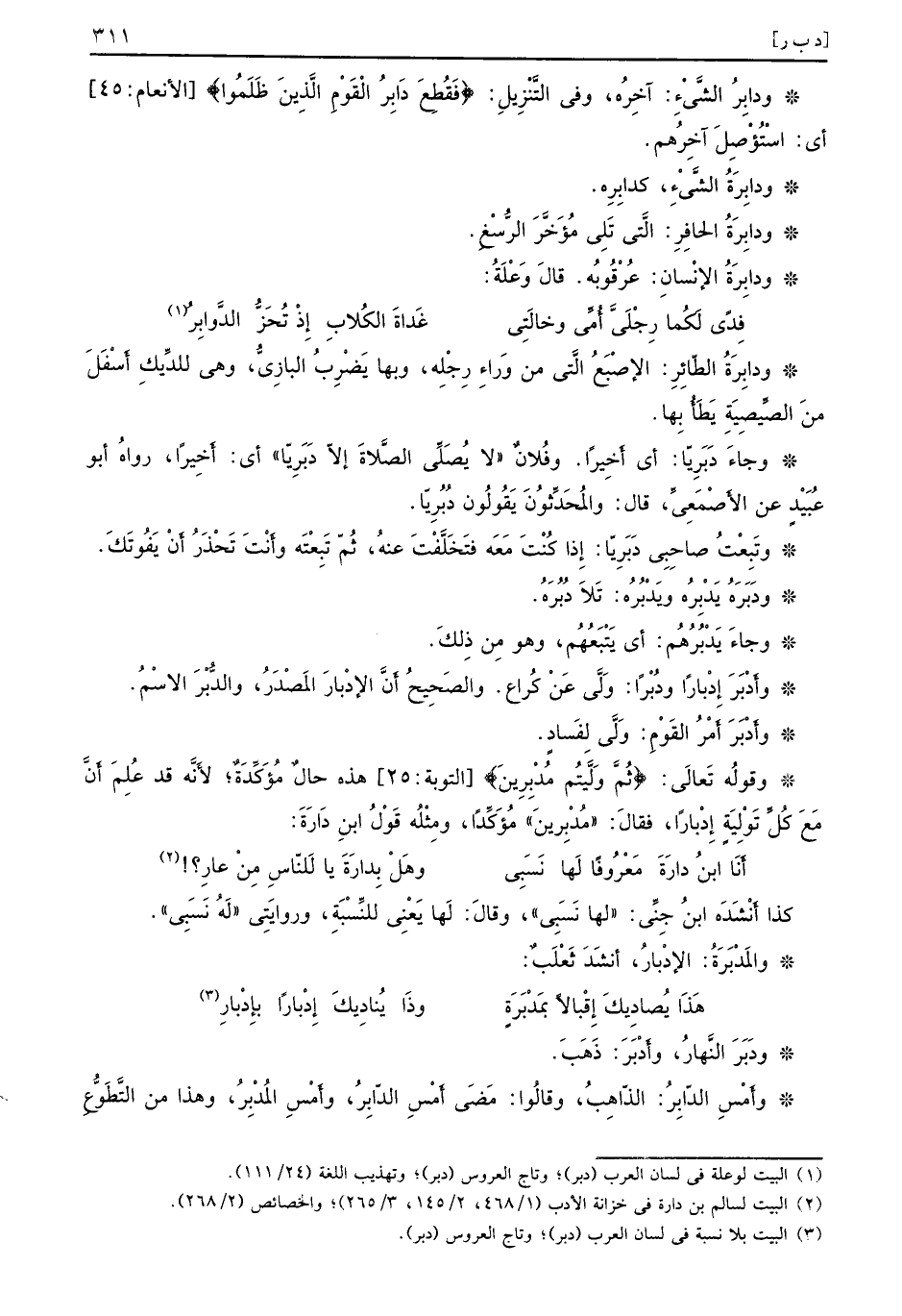 ودابِرَةُ الطّائِرِ: الإصْبَعُ التَّي من وَراءِ رِجْلِه، وبها يَضْرِبُ البازِيُّ، وهي للدِّيكِ أَسْفَلَ منَ الصِّيصِيَةِ يَطَأُ بِها. وجاءَ دَبَرِيّا: أي أَخِيراً. وفُلانٌ ((لا يُصَلِّي الصَّلاةَ إلاّ دَبَرَياً)) أي: أَخِيراً، رواهُ أبو عُبَيْدٍ عن الأَصْمَعِيِّ، قال: والمُحَدِّثُونَ يَقُولُون دُبُرِيّا. وتَبِعْتُ صاحِبِي دَبَرِيّا: إِذا كُنْتَ مَعَه فَتخَلَّفْتَ عنهُ، ثُمّ تَبَعْتَه وأَنْتَ تَحْذَرُ أَنْ يَفُوتَكَ. ودَبَرَهُ يَدْبِرُه ويَدْبُرُه: تلا دُبُرَهُ وجاءَ يَدْبُرهُم: أي يَتْبَعُهُم، وهو مِن ذِلكَ. وأَدْبَرَ إِدْباراً ودُبْراً: وَلَّي عَنْ كُراع. والصَحِيحُ أَنَّ الإدْبارَ المَصْدرُ، والدُّبْرَ الاسُمْ. وأَدْبَرَ أَمْرُ القَومْ: وَلَّي لِفَسادٍ. وقولُه تَعالَى: {ثم وليتم مدبرين} [التوبة: 25] هذه حالٌ مَؤَكِّدَةٌ؛ لأَنَّه قد عُلِمَ أَنَّ مَعَ كُلِّ تَوْلِيَةِ إِدْباراً، ققال: ((مُدْبِرينَ)) مَؤَكِّداً، ومِثْلُه قُوْلُ ابنِ دَارَةَ: