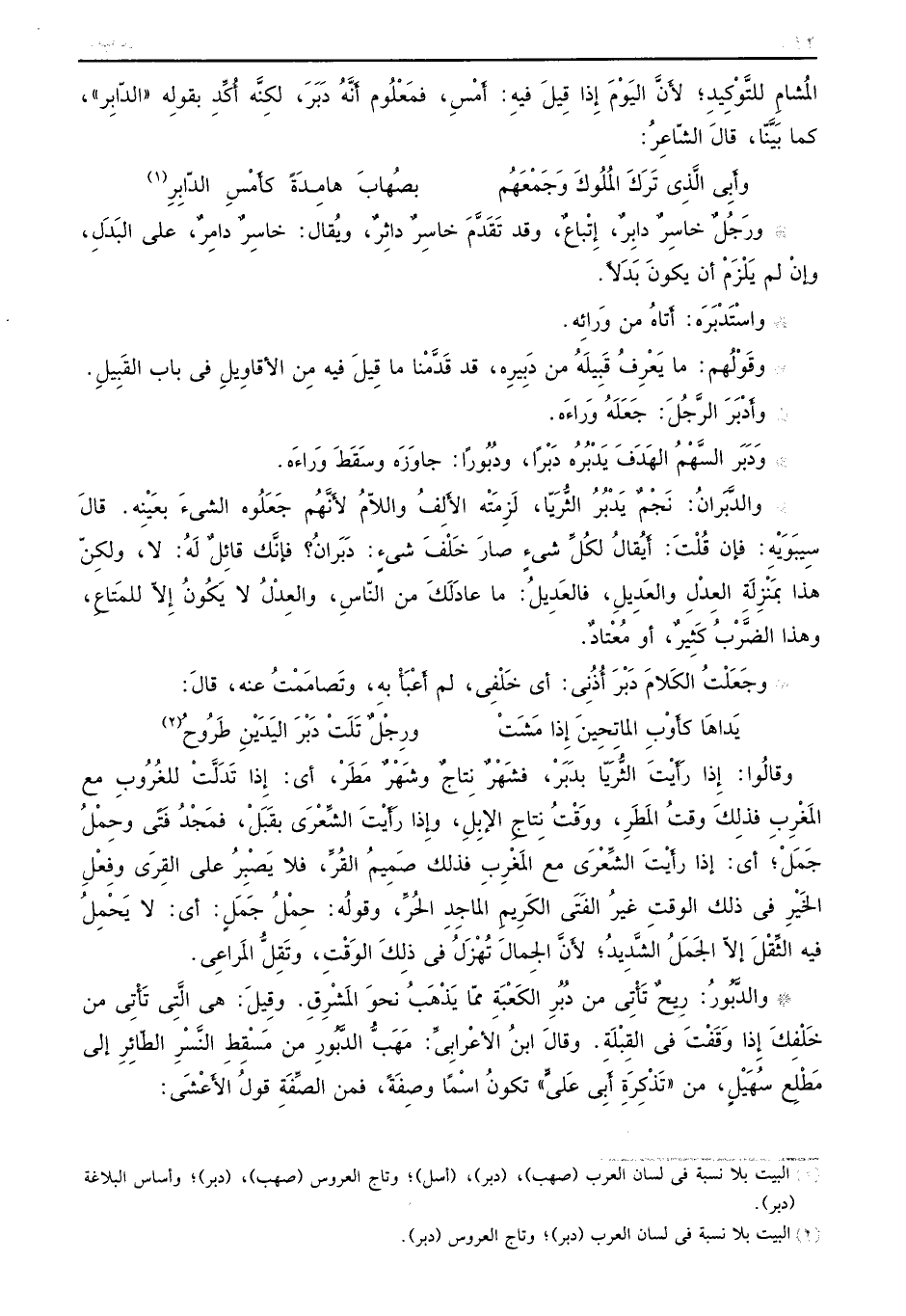 ورَجُلٌ خاسِرٌ دابِرٌ، إِتْباعٌ، وقد تَقَدَّمَ خاسِرٌ داثرٌ، ويُقال: خاسِرٌ دامِرٌ، على البَدَلِ، وإنْ لم يَلْزَمْ أن يكونَ بَدَلاً. واسْتَدْبَرَه: أَتاهُ من وَرائِه. وقَوْلُهم: ما يَعْرِفُ قَبِيلَهُ من دَبِيرِه، قد قَدَّمْنا ما قِيلَ فيه مِن الأقاوِيلِ في باب القَبِيلِ. وأَدْبَرَ الرَّجُلَ: جَعَلُه وَراءةَ. وَدَبَر السَّهْمُ الهَدَفَ يَدْبُرهُ دَبْراً، ودُبُوراً: جاوَزَه وسَقَطَ وَراءه. والدَّبَرانُ: نَجْمٌ يَدْبُرُ الثُّرَيّا، لَزِمَتْه الأَلِفُ واللاّمُ لأَنَّهُم جِعَلُوه الشيءِ بعِيْنه. قالَ سِيبَوَيهْ: فإن قُلْتَ: أَيُقالُ لكُلِّ شيءْ صارَ خَلْفَ شيءٍ: دَبَرانُ؟ فإنَّكِ قائِلٌ لَهُ: لا، ولكِنّ هذا بمَنْزِلَة العِدْل والعَدِيلِ، فالعَدِيلُ: ما عادَلَكَ من النّاسِ، والعِدْلُ لا يَكُونُ إِلاّ للمَتاعِ، وهذا الضَّرْبُ كَثَيرٌ، أو مُعْتادٌ. وجَعَلْتُ الكلامَ دَبْرَ أُذُنِي: أي خَلْفِي، لم أَعْبَأْ بهِ، وتصامَمْتُ عنه، قالَ