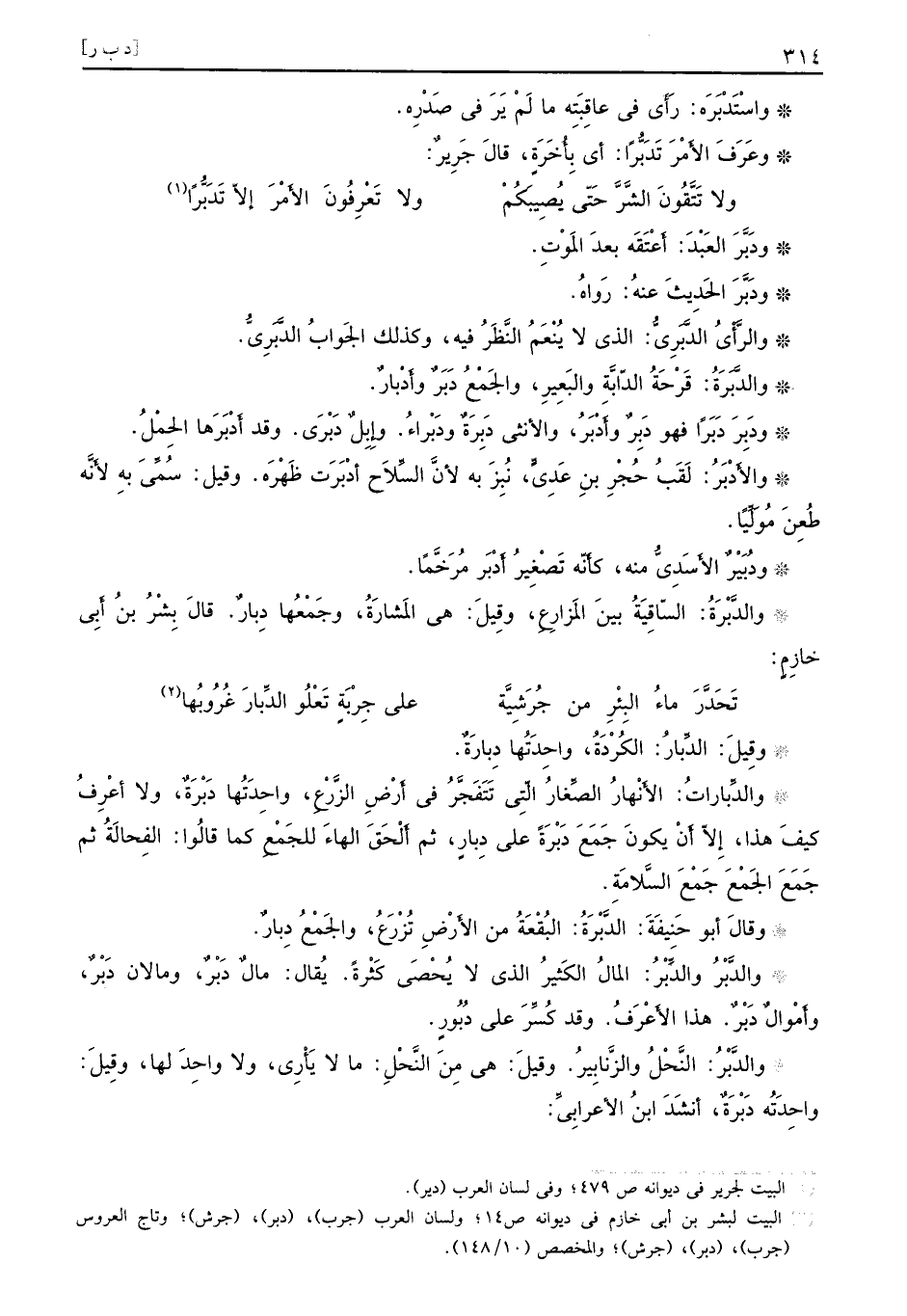 ودَبَّرَ العَبْدَ: أَعْتَقَه بعدَ المَوْتِ. ودَبَّرَ الحَدِيثَ عنهُ: رَواهُ. والرَّأْيُ الدًَّبَرِيُّ: الذي لا يُنْعَمُ النَّظَرُ فيه، وكذلك الجَوابُ الدَّبَرِيُّ. والدَّبَرَةُ: قَرْحَةُ الدَّابَّة والبَعِيرِ، والجَمْعُ دَبَرٌ وأَدْبارٌ. ودَبَرَ دَبَراً فهو دَبِرٌ وأَدْبَرُ، والأنثي دَبِرَةٌ ودَبْراءُ. وإِبِلٌ دَبْرَى. وقد أَدْبَرَها الحِمْلُ. والأَدْبَرُ: لَقَبُ حُجْرِ بنِ عَدِيٍّ، نُبِزَ به لأنَّ السِّلاَح أدْبَرَت ظَهْرَه. وقيل: سُمِّيَ بهِ لأَنَّه طُعْنَ مُوَلِّياً. ودُبَيْرٌ الأَسَدِيُّ منه، كأَنّه تَصْغِيرُ أَدْبَرَ مُرْخَّماً. والدَّبْرَةُ: السّاقِيَةُ بينَ المَزارِعِ، وقِيلَ: هي المَشارَةُ، وجَمْعَها دبِارٌ. قالَ بِشْرُ بنُ أَبِي خازِمٍ:
