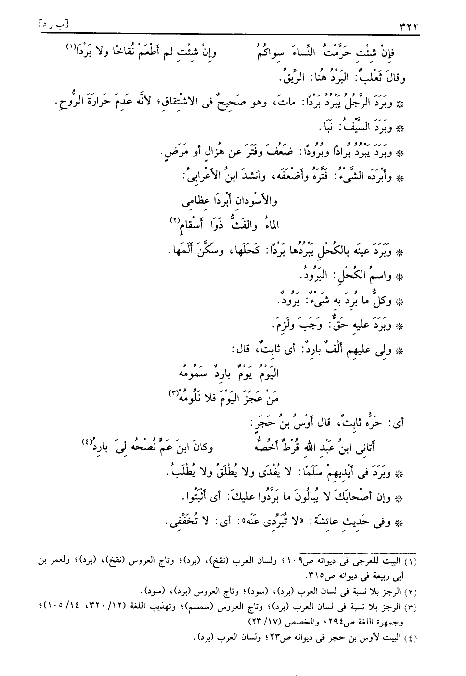 وبَرَدَ في أَيْدِيهِمْ سَلَماً: لا يُفْدَي ولا يُطْلَقُ ولا يُطْلَبُ. وإن أصْحابَكَ لا يُبالُونَ ما بَرَّدُوا عليكَ: أي أَثْبَتُوا. وفي حَدِيثِ عائِشَة: ((لا تُبَرِّدِي عَنْه)) : أي: لا تُخَفِّفِي.