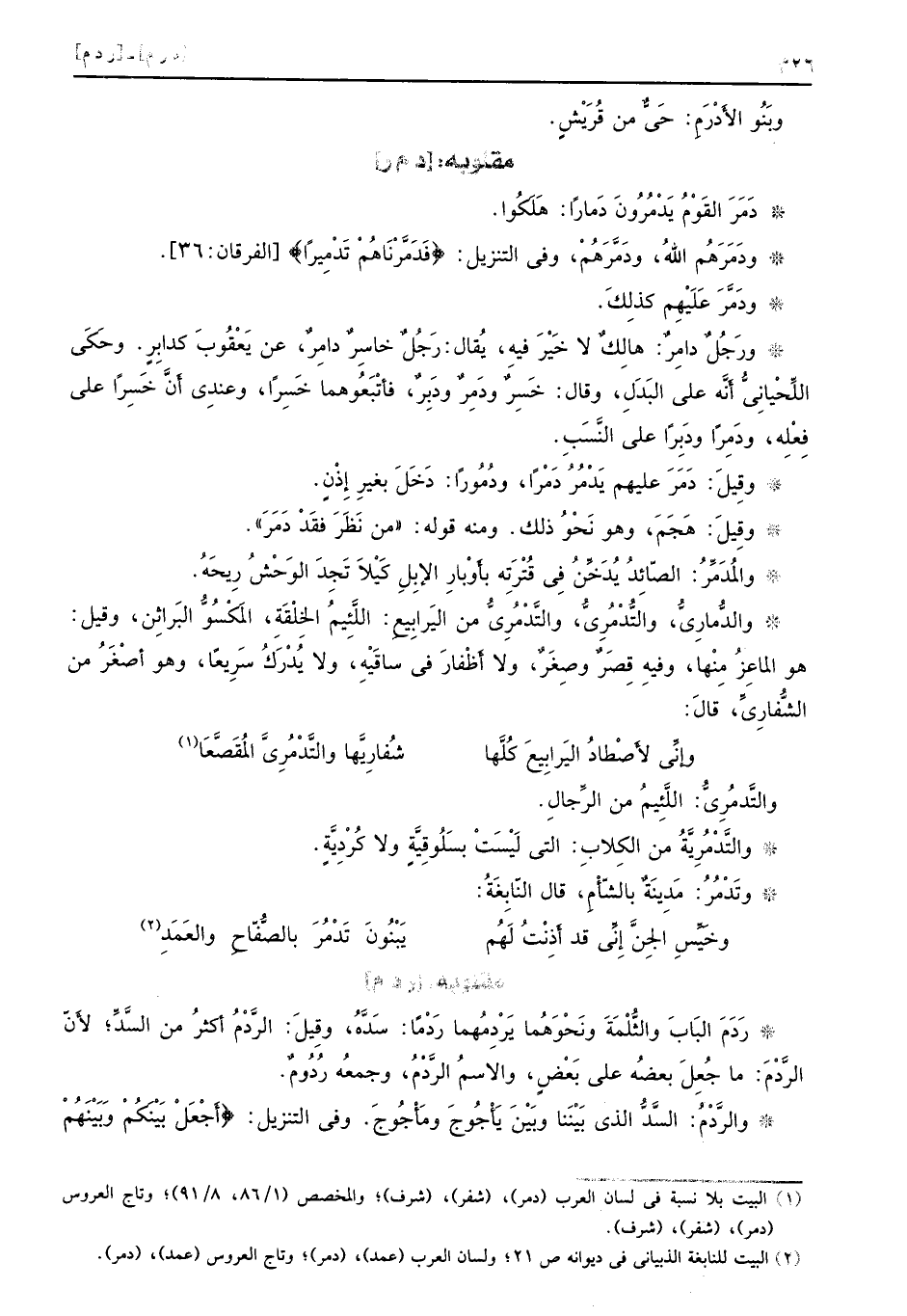 [د م ر] دَمَرَ الَقْومُ يَدْمُرُونَ دَماراً: هَلَكوا. ودَمَرَهُم اللهُ، ودَمَّرَهُمْ، وفي التنزيل: {فدمرناهم تدميرا} [الفرقان: 36] . ودَمَّرَ عَلَيْهمِ كذِلكَ. ورَجُلٌ دِامرٌ: هالِكٌ لا خَيْرَ فيهِ، يُقال: رَجُلٌ خاسِرٌ دامِرٌ، عن يَعْقُوبَ كدابِرٍ. وحَكَى اللٍّ حْيانَيُّ أَنَّه على البَدَلِ، وقال: خَسِرٌ ودَمِرٌ ودَبِرٌ، فأتْبَعُوهما خَسرِاً، وعندِي أنَّ خَسِراً على فِعْلِه، وِدَمراً ودَبِراً على النَّسَبِ. وقِيلَ: دَمَرَ عليهم يَدْمُرُ دَمْراً، ودُمُوراً: دَخَلَ بغيرِ إِذْنٍ. وقِيلَ: هَجَمَ، وهو نَحْوُ ذلك. ومنه قوله: ((من نَظَرَ فقَدْ دَمَرَ)) . والمُدَمِّرُ: الصّائِدُ يُدَخِّنُ فِي قُتْرِتَه بأَوْبارِ الإِبلِ كَيْلاً تَجِدَ الوَحْشُ رِيحُه. والدُّمارِيُّ، والتُّدْمُرٍ يُّ، والتَّدْمُرِيُّ من اليَرابِيعِ: اللَّئِيمُ الخِلْقَةَ، المَكْسُوُّ البَراثِن، وقيل: وهو الماعِزُ مِنْها، وفيهِ قِصَرٌ وصِغَرٌ، ولا أَظْفارَ في ساقَيْهِ، ولا يُدْرَكُ سَرِيعاً، وهو أصْغرُ من الشُّفارِيِّ، قالَ: