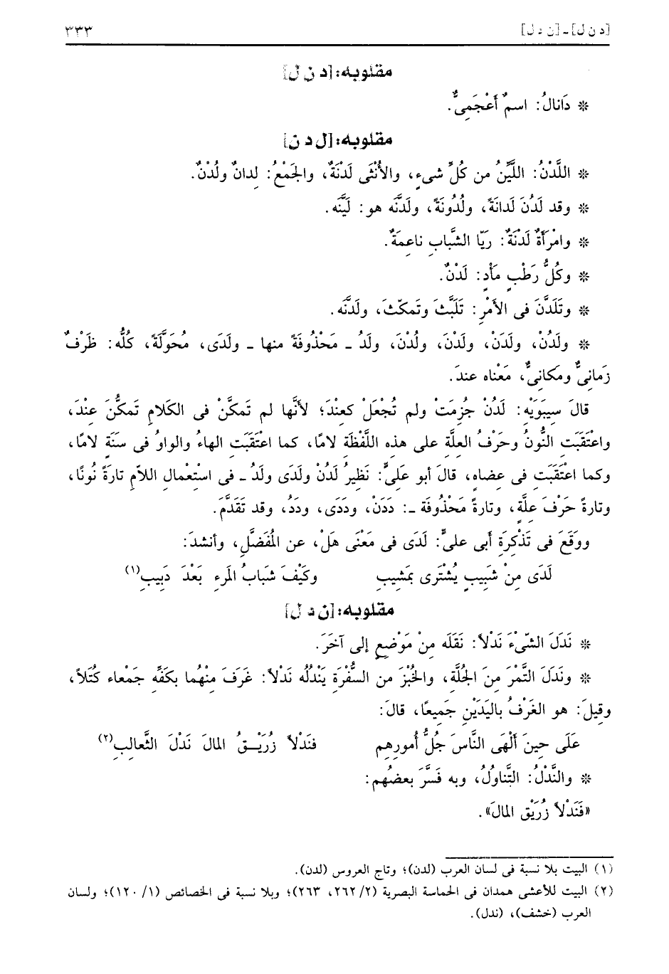 : [ل د ن] اللَّدْنُ: اللَّيِّنُ من كُلِّ شيءٍ، والأُنْثَى لَدْنَةٌ، والجَمْعُ: لِدانٌ ولُدْنٌ. وقد لَدُنَ لَدانَةً، ولُدُونَةً، ولَدَّنَه هو: لَيَّنَه. وامْرَأَةُ لَدْنَةٌ: رَيّا الشَّبابِ ناعِمَةٌ. وكُلُّ رَطْبٍ مَأْدٍ: لَدْنٌ. وتَلَدَّنَ في الأًَمْرِ: تَلَبَّثَ وتَمكّثَ، ولَدَّنَه. ولَدُنُ، ولَدَنْ، ولُدْنَ، ولَدُ _ محْذُوفَةً منها - ولَدَى، مُحَوَّلَةً، كُلُّه: ظَرْفٌ زَمانِيٌّ ومَكانِيٌّ، مَعْناه عندَ. قالَ سِيبَوِيْهْ: لَدْنْ جُزِمَتْ ولم تِجْعَلْ كِعنْد؛ لأَنَّها لم تَمْكَّنْ في الكَلامِ تَمكُّنَ عِنْدَ، واعْتَقَبَتِ النُّونُ وحَرْف العِلَّةِ على هذِه اللَّفْطَةِ لامًا، كما اعْتَقَبَتِ الهاءُ والواوُ في سَنَة لامًا، وكما اعْتَقَبِتِ في عِضاهٍ، قالَ أبو عَلِيٍّ: نَظيرُ لَدُنْ وَلَدَى ولَدُ - في اسْتِعْمالِ اللاّمِ تارَةً نُوناً، وتارةً حَرْفَ عِلَّةٍ، وتارةً مَحْذُوفَة -: دَدَنْ، ودَدَى، ودَدُ، وقد تَقَدَّمَ. ووَقَعَ في تَذْكِرَةِ أَبي عليٍّ: لَدَى في مَعْنَى هَلْ، عن المُفَضَّلِ، وأنشدَ: