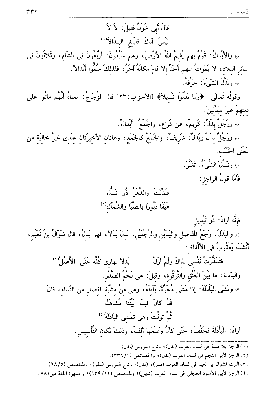 والأَبْدال: قَوْمٌ بهم يُقِيمُ اللهُ الأَرْضَ، وهم سَبْعُونَ: أَرْبَعُونَ في الشّامِ، وثَلاثُونَ في سائِرِ البِلاِد، لا يَمُوتُ منهم أَحَدٌ إِلا قامَ مكانَةُ آخَرُ، فلذِلكَ سُمُّوا أَبْدالاً. وبَدَّلَ الشَيْءَ: حَرَّفَةُ. وقولُه تَعالَى: {وما بدلوا تبديلا} [الأحزاب: 23] قال الزَّجّاجُ: معناهُ أَنَّهُم ماتُوا على دِينِهِمْ غيرَ مَبدِّبلينَ. ورَجُلٌ بَدْلٌ: كَرِيمُ، عن كُراع، والجَمْعُ: أَبْدالٌ. ورَجُلٌ بِدْلٌ وبَدَلٌ: شَرِيفٌ، والجَمْعُ كالجَمْعِ، وهاتانِ الأَخِيرتَانِ عِنْدِي غيرُ خالِيَةٍ من مَعْنَى الخَلَفِ. وتَبَدَّلَ الشَّْيْءُ: تَغَيَّرَ. فأَمّا قولُ الراجِزِ: