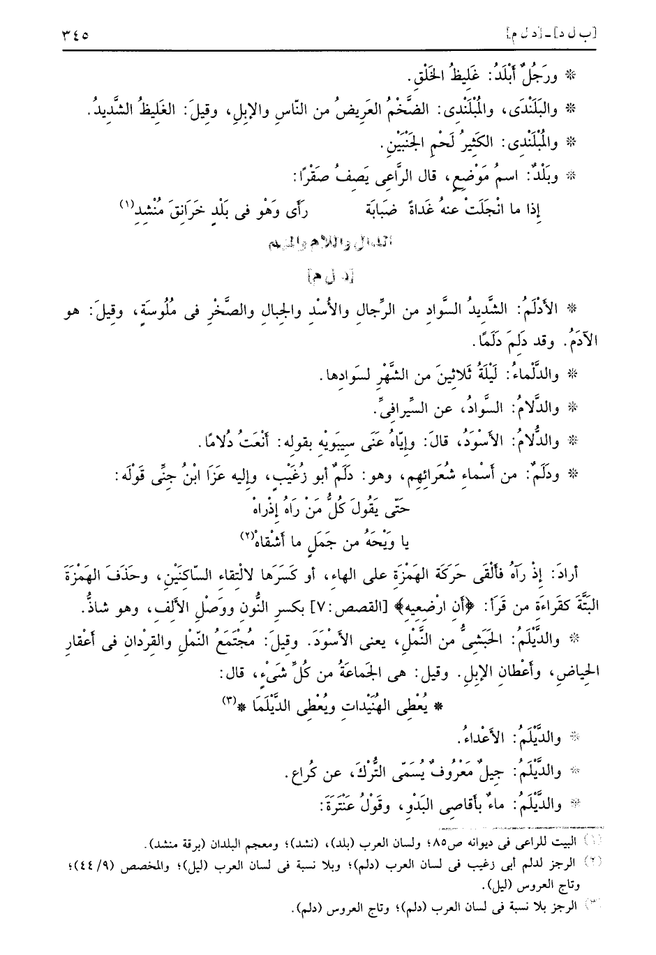 [د ل م] والأَدْلَم: الشَّديدُ السَّوادِ من الرِّجالِ والأُسْدِ والجِبالِ والصَّخْرِ في مُلُوسَةٍ، وقِيلَ: هو الآدَمُ. وقد دَلِمَ دَلَماً. والدَّلْماءُ: لَيْلَةُ ثَلاثِينَ من الشَّهْرِ لسَوادِها. والدَّلامُ: السَّوادُ، عن السيِّرافِيِّ. والدُّلامُ: الأَسْوَدُ قالَ: وإِيّاهُ عَنَى سِيبَويْهِ بقولِه: أَنْعَتُ دُلامًا. دَلَمٌ: من أَسْماءِ شُعَرائِهمِ، وهو: دَلَمٌ أبو زَُغَيْبٍ، وإِليه عَزَا ابْنُ جِنِّي قَوْلَه: