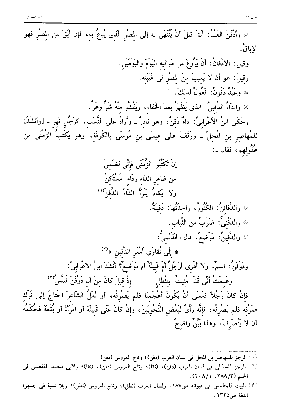 وأَدْفَنَ العَبْدُ: أَبَقَ قبلَ أنْ يُنْتَهَى به إلى المِصْرِ الّذِي يُباعُ بهِ، فإن أَبَقَ من المَصِْرِ فهو الإباقُ. وقيل: الأدِّفانُ: أَنْ يَرُوغَ من مُوالِيهِ اليَوْمَ واليَوْمَيْنِ. وقِيلَ: هو أَن لا يَغِيبَ مِنَ المِصْرِ في غَيْبِتَه. وعَبْدٌ دَفُونٌ: فَعُولُ لذِلِكَ. والدّاءُ الدَّفِينُ: الذي يَظْهَرُ بعدَ الخَفاءِ، ويَفْشُو مِنْهُ شَرٌّ وعَرٌّ. وحَكَى ابنُ الأَعْرابِيِّ: داءٌ دَفِنٌ، وهو نادِرٌ - وأُراهُ على النَّسَبِ، كرَجُلٍ نَهرِ -[وأنشَدَ] للمُهاصِرِ بنِ المُحِلِّ - ووَقَفَ على عِيسَى بنِ مُوسَى بالكُوفَةِ، وهو يَكتِبُ الزَّمْنَى من عُقُولِهم، فقال _: