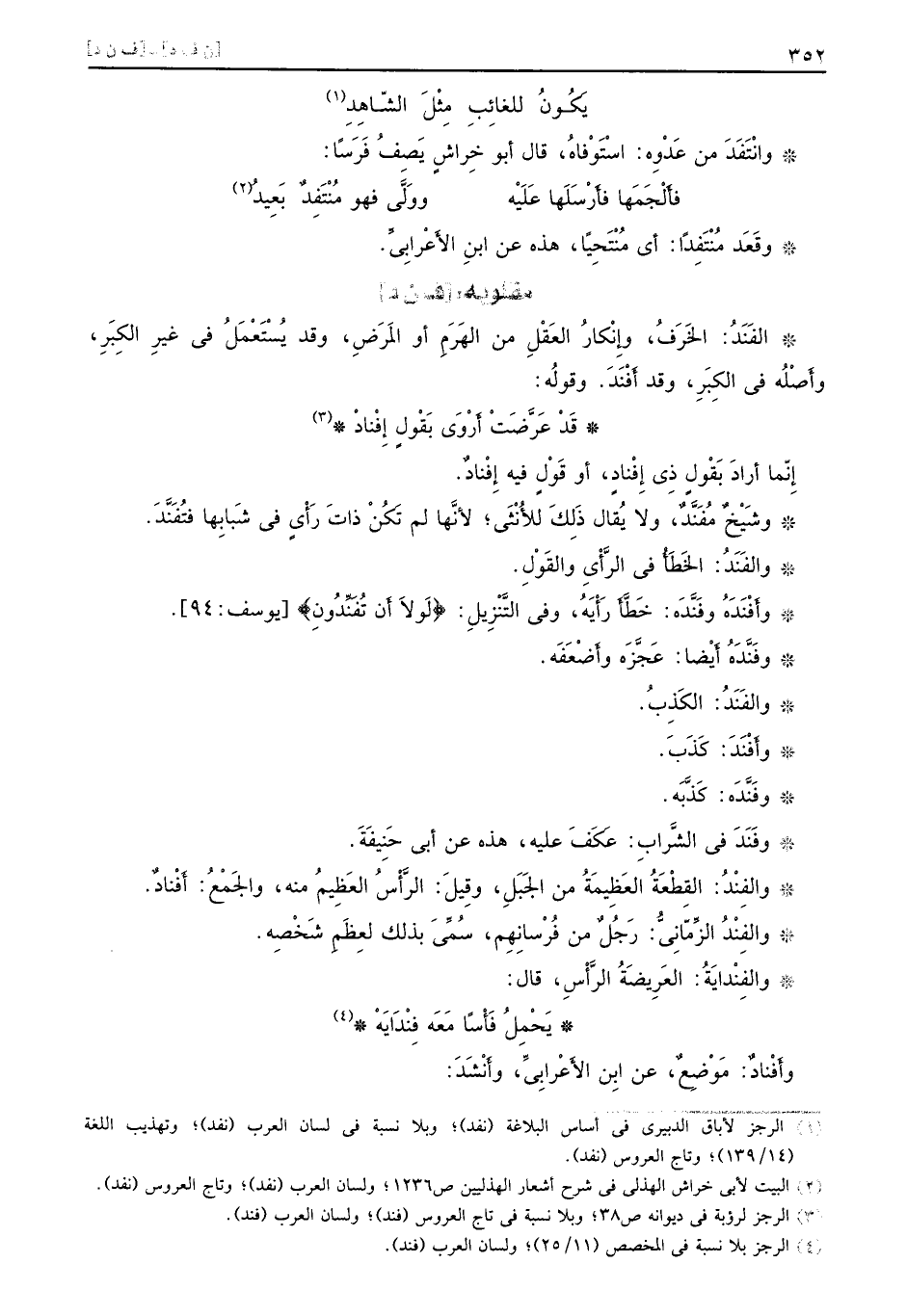 إِنّما أرادَ بَقْولِ ذِي إِفْنادِ، أو قَوْلِ فيه إِفْنادٌ. وشَيْخٌ مُفَنَّدٌ، ولا يُقال ذَلِكَ للأُنْثَى؛ لأنَّها لم تَكْنْ ذاتَ رَأْيِ في شَبابِها فتُفَتَّدَ. والفَنَدُ: الخَظّأُ في الرَّاْيِ والقْوْلِ. وأفْنَدَهُ وفَنَّدَه. خَطَّأَ رَأْيَهُ، وفي التَّنْزِيلِ: {لولا أن تفندون} [يوسف: 94] . وفَنَّدَهُ أَيْضاً: عَجَّزَه وأَضْعَفَه. والفَنَدُ: الكَذِبُ. وأَفْنَدَ: كَذَبَ. وفَنَّدَه: كَذَّبَه. وفَنَدَ في الشَّرابِ: عَكَفَ عليه، هذه عن أبي حَنِيفَةَ. والفِنْدُ: القِطْعَةُ العَظِيمَةُ من الجَبَلِ، وقِيلَ: الرَّأْسُ العَظِيمُ منه، والجَمْعُ: أَفْنادٌ. والفِنْدُ الزِّمّانِيُّ: رَجُلٌ من فُرْسانِهم، سُمِّى بذلكَ لِعظَمِ شَخْصِه. والفِنْدايَةُ: العَرِيضَةُ الرَّأْسِ، قال: